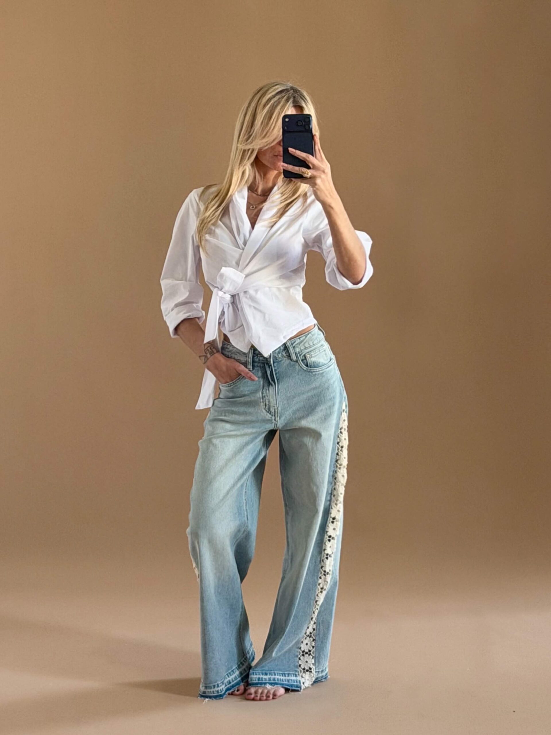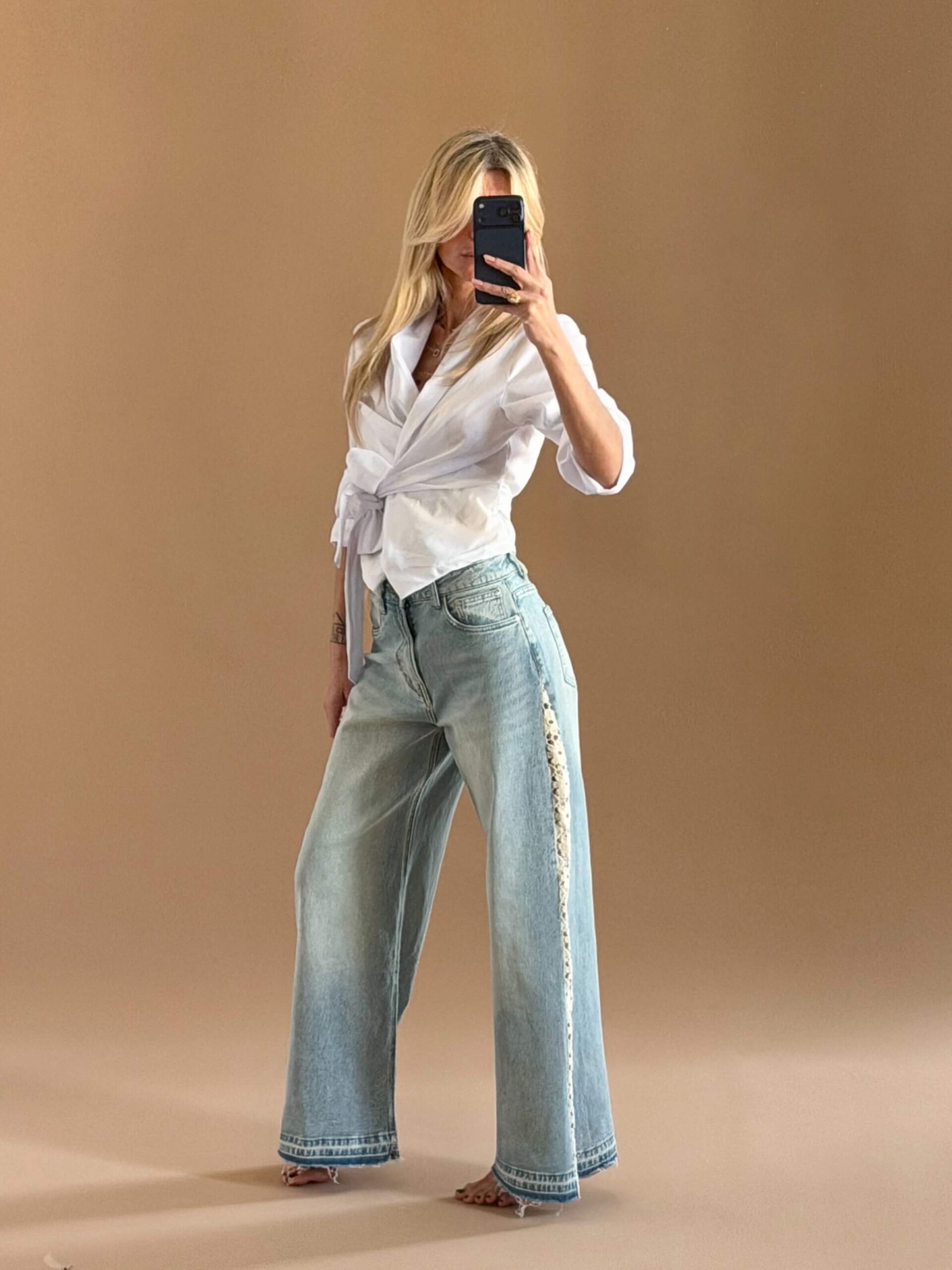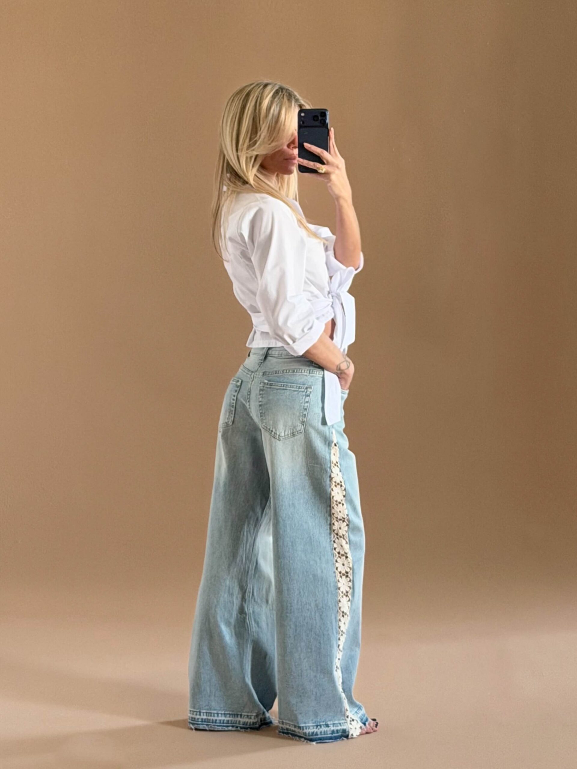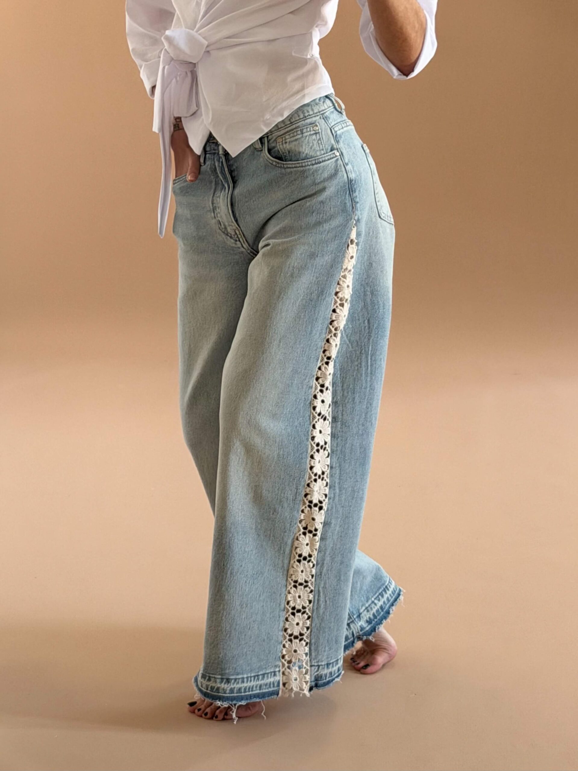 Τζιν παντελόνι σε baggy γραμμή, σε μπλε washed απόχρωση, με ιδιαίτερη δαντέλα στο πλάι σε όλο το μήκος του ποδιού.