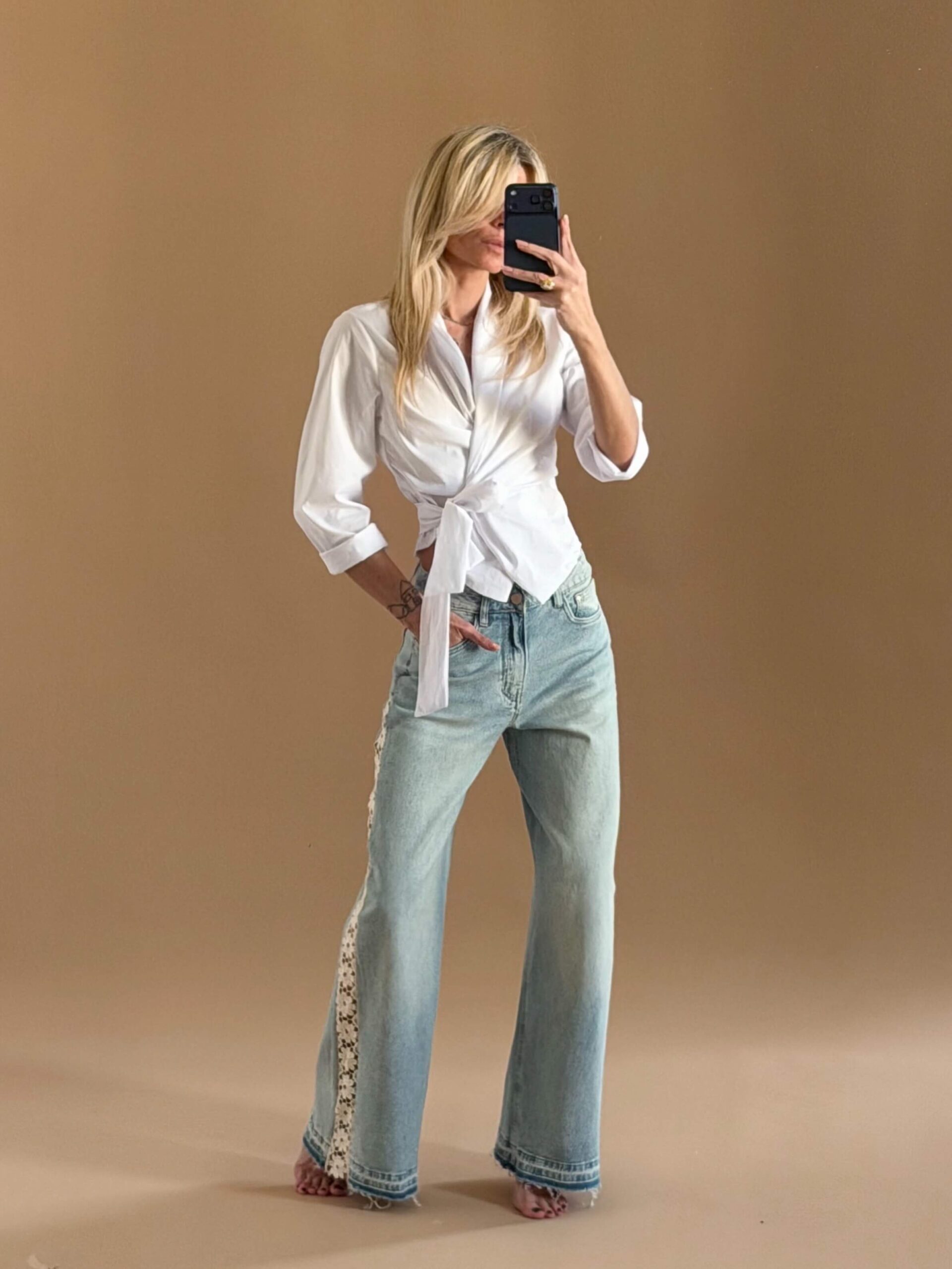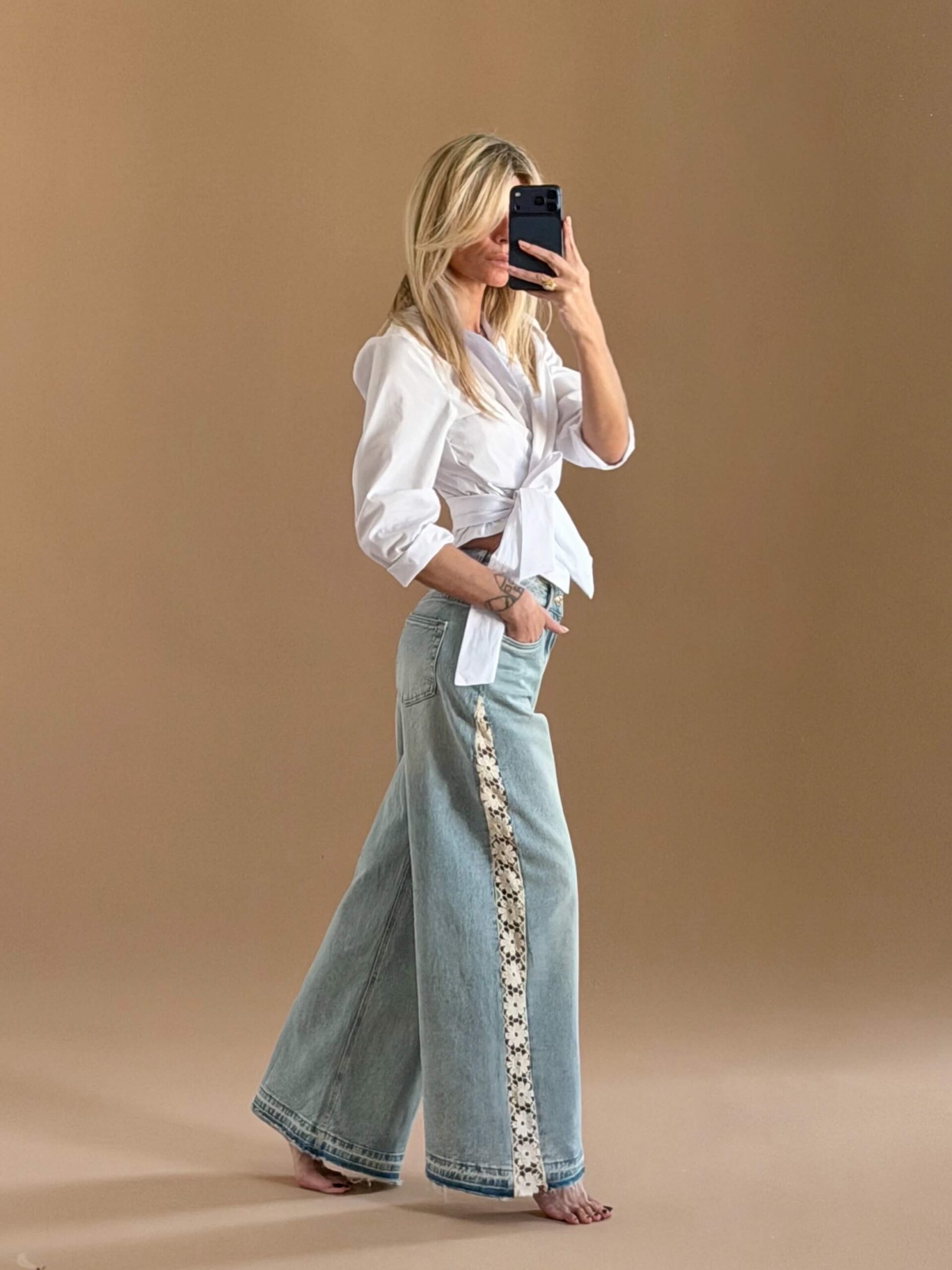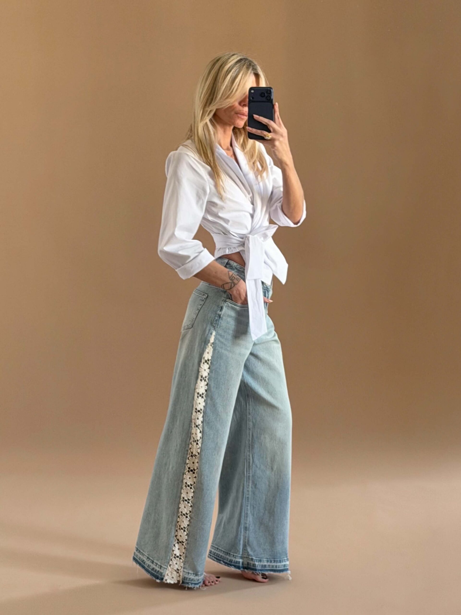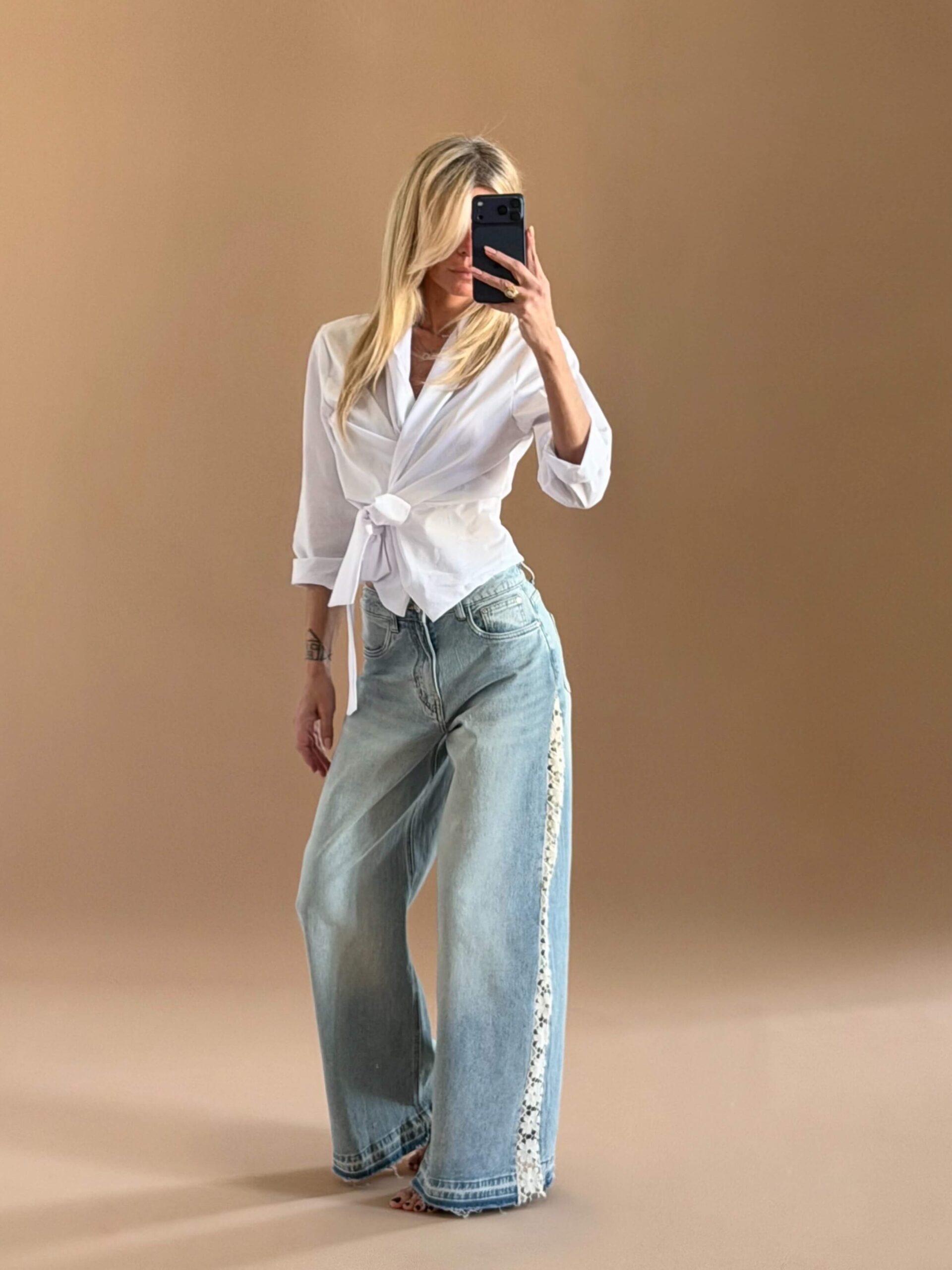 Τζιν παντελόνι σε baggy γραμμή, σε μπλε washed απόχρωση, με ιδιαίτερη δαντέλα στο πλάι σε όλο το μήκος του ποδιού.