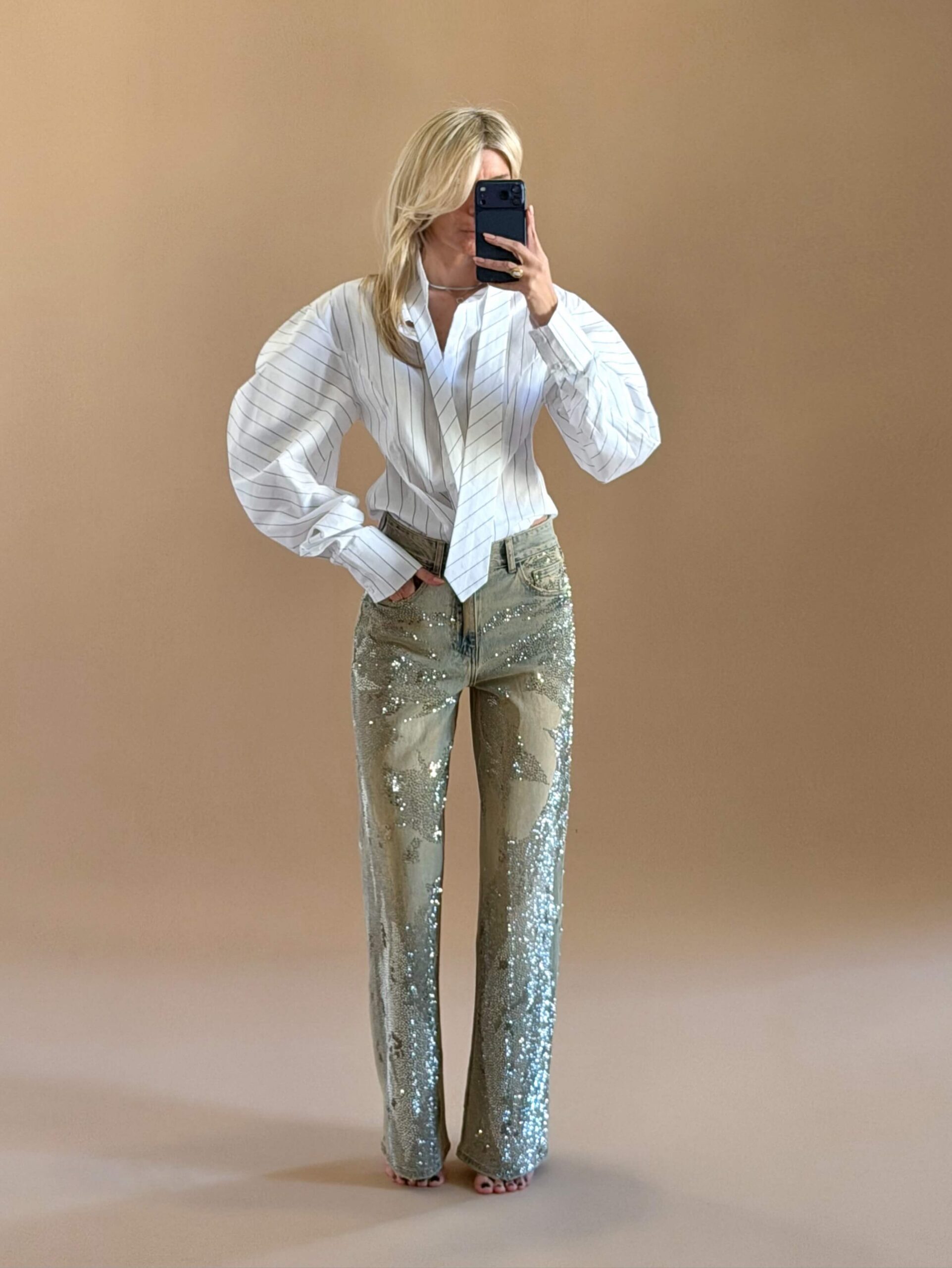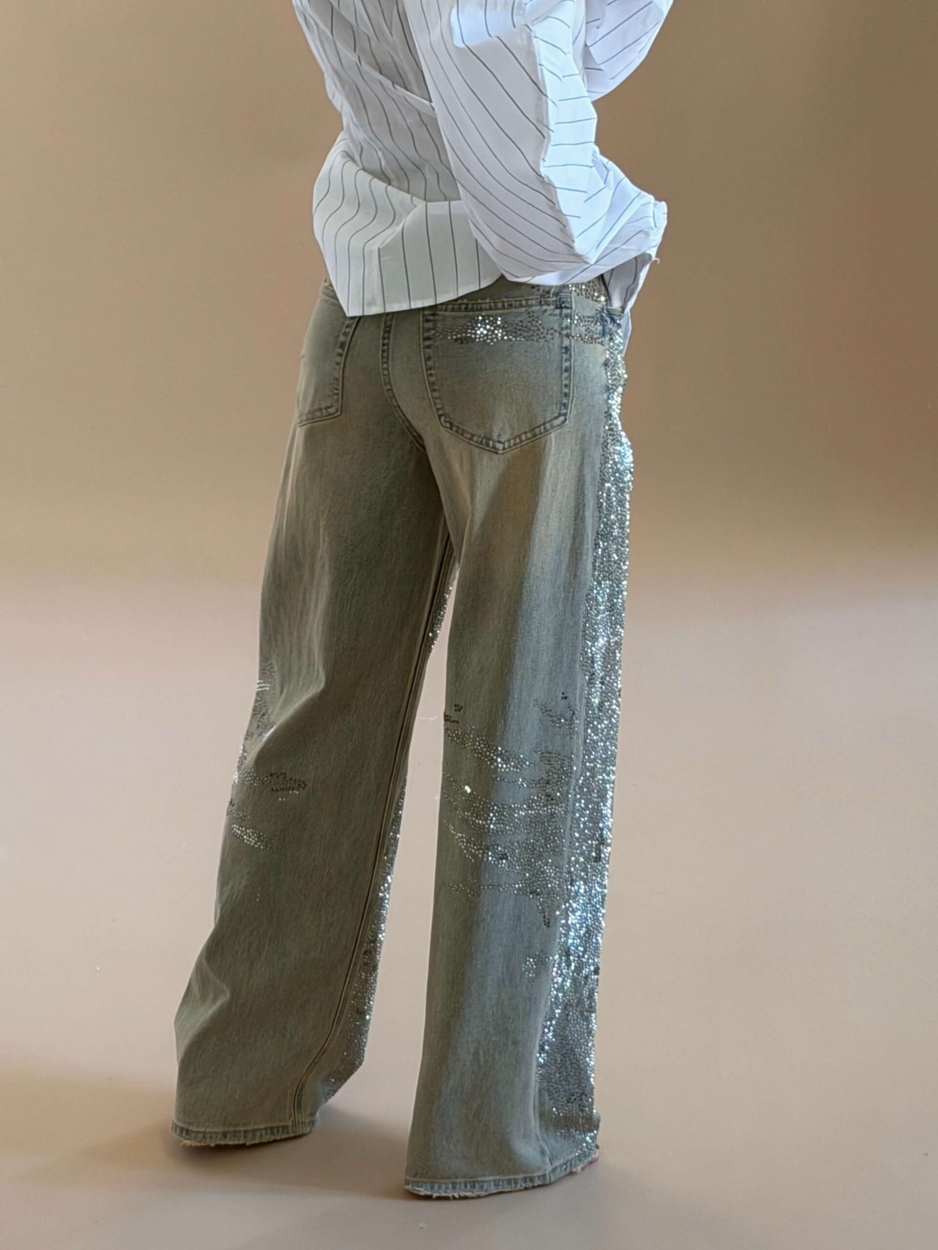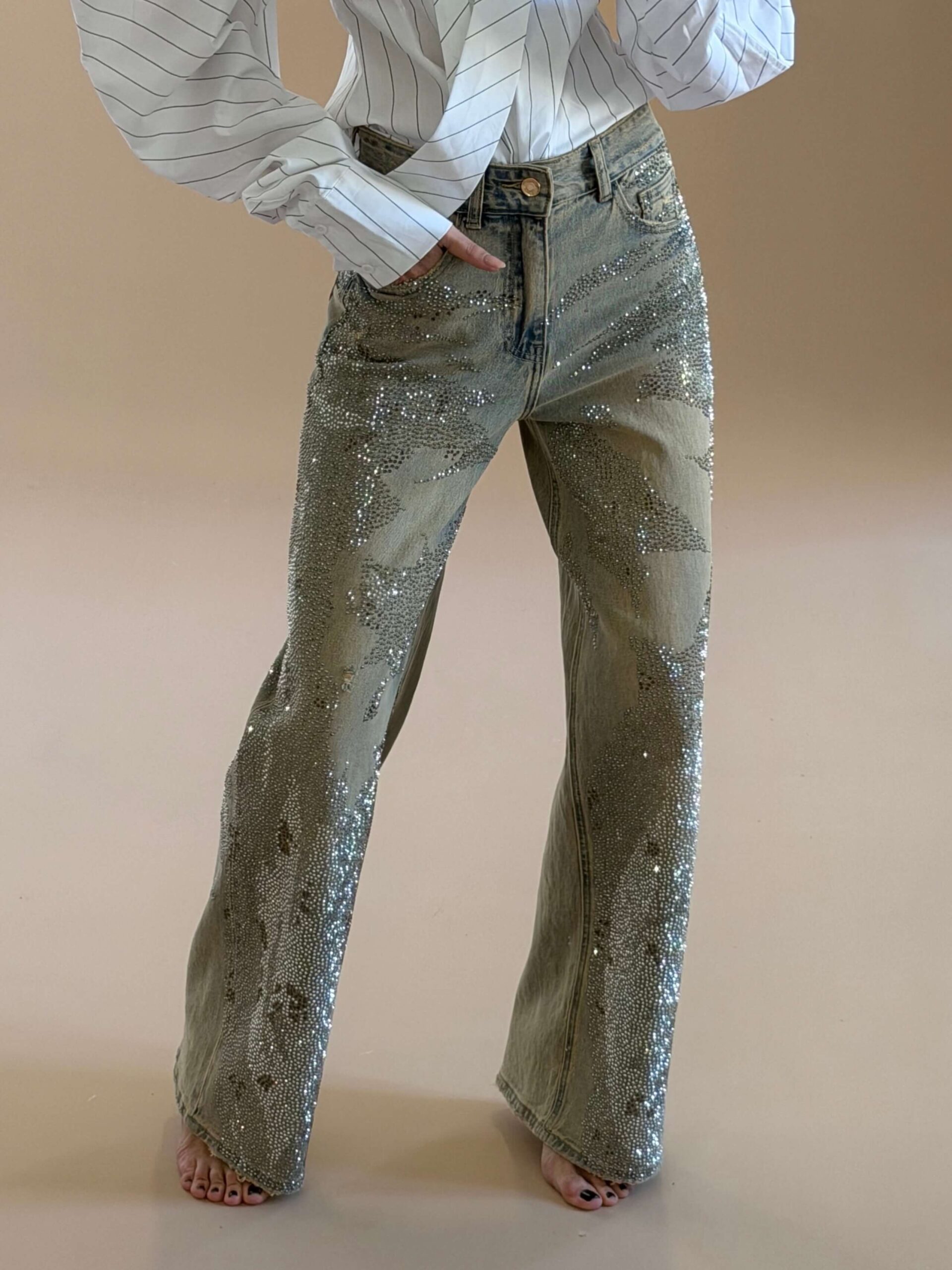 Εντυπωσιακό τζιν παντελόνι με ελαστικότητα, διακοσμημένο με λαμπερά στρας που δημιουργούν μοναδικό statement αποτέλεσμα.