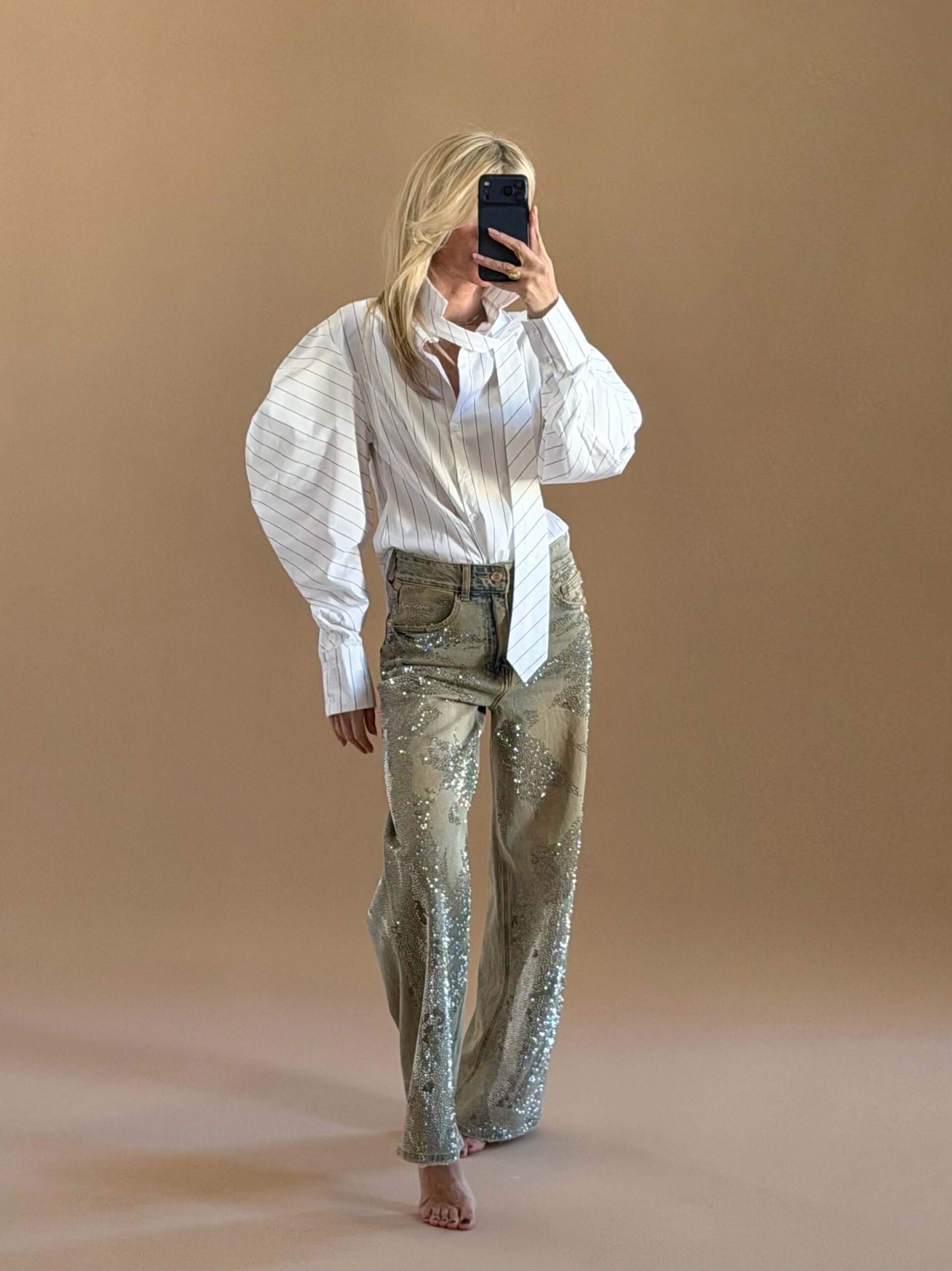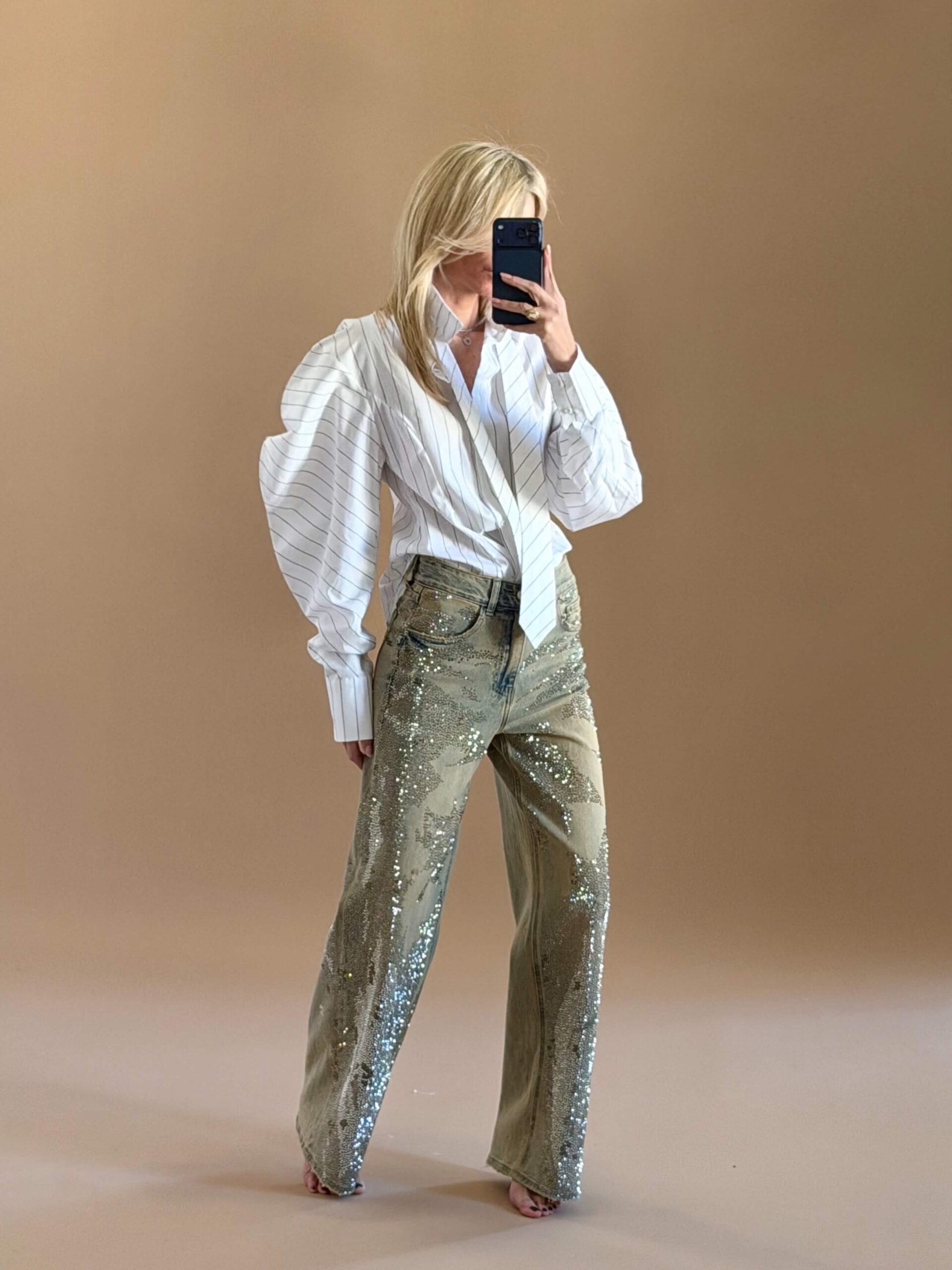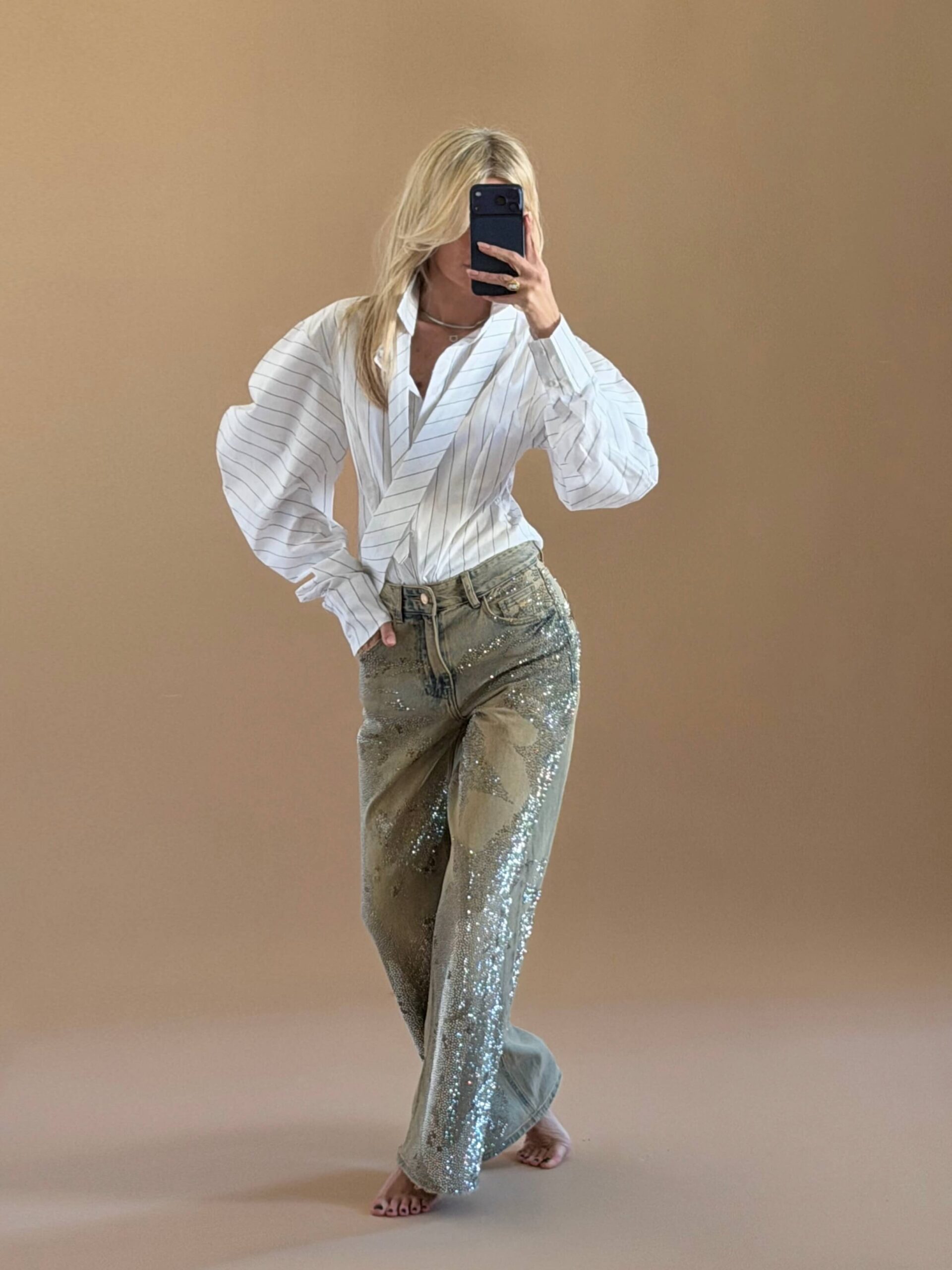 Εντυπωσιακό τζιν παντελόνι με ελαστικότητα, διακοσμημένο με λαμπερά στρας που δημιουργούν μοναδικό statement αποτέλεσμα.