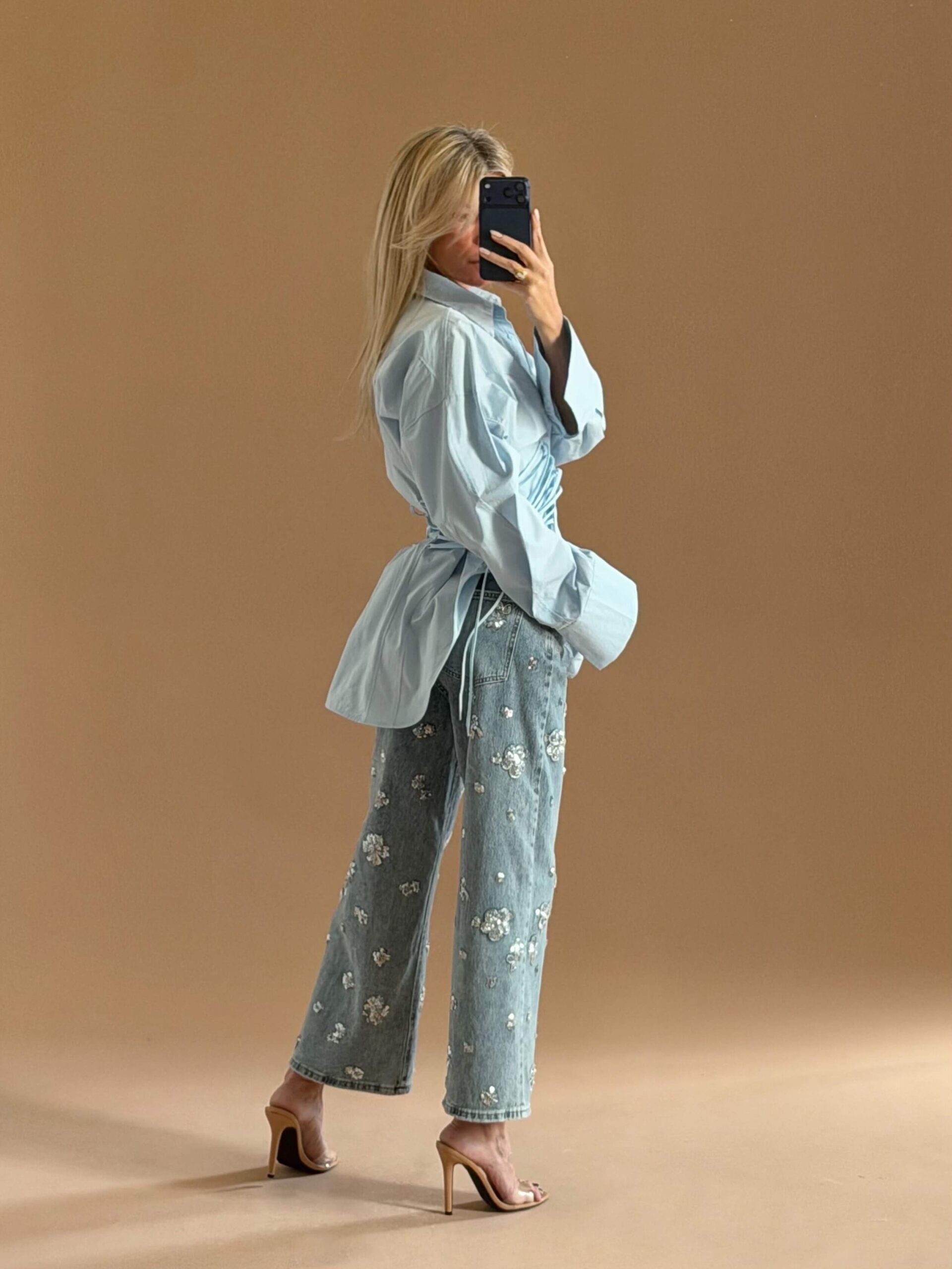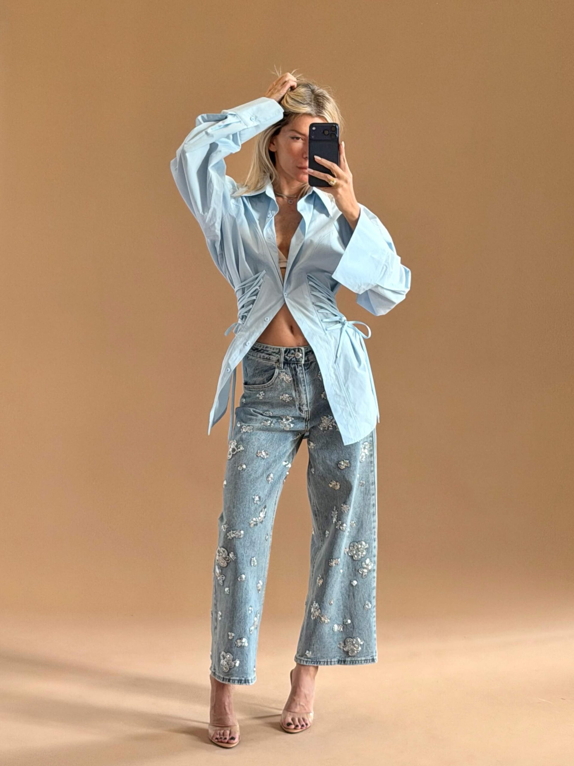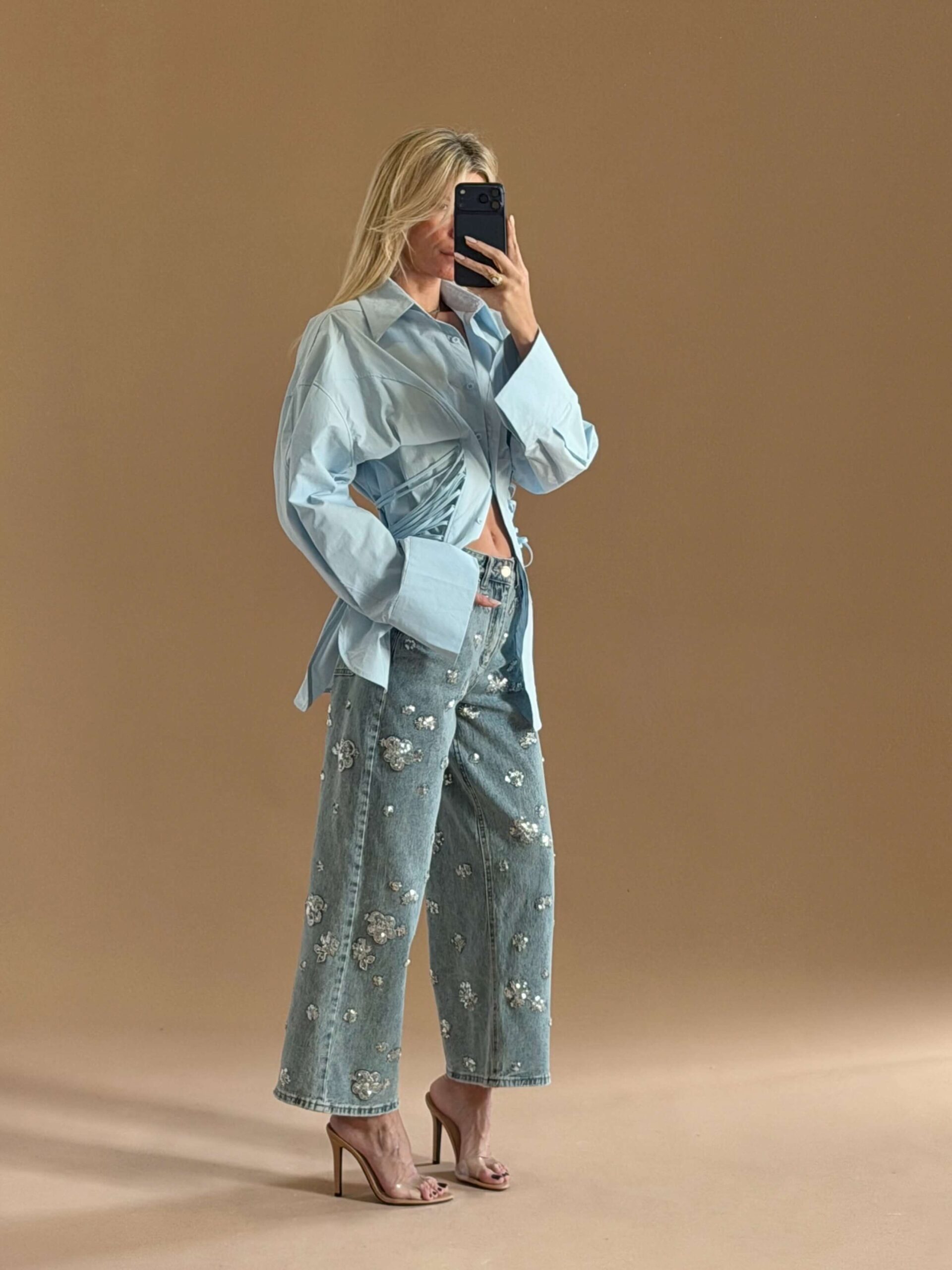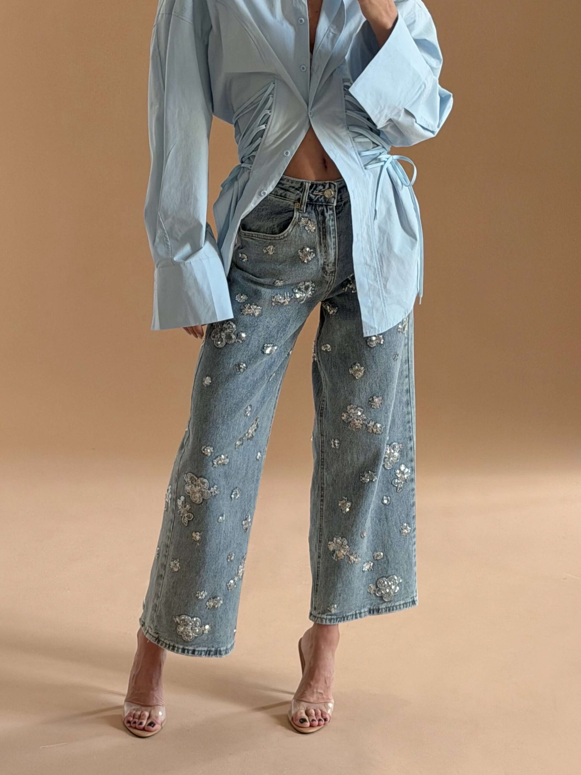Τζιν παντελόνι σε γραμμή cropped με wide leg άνοιγμα, κεντημένο με παγιέτες και χάντρες σε floral μοτίβα που χαρίζουν ιδιαίτερο και λαμπερό χαρακτήρα.