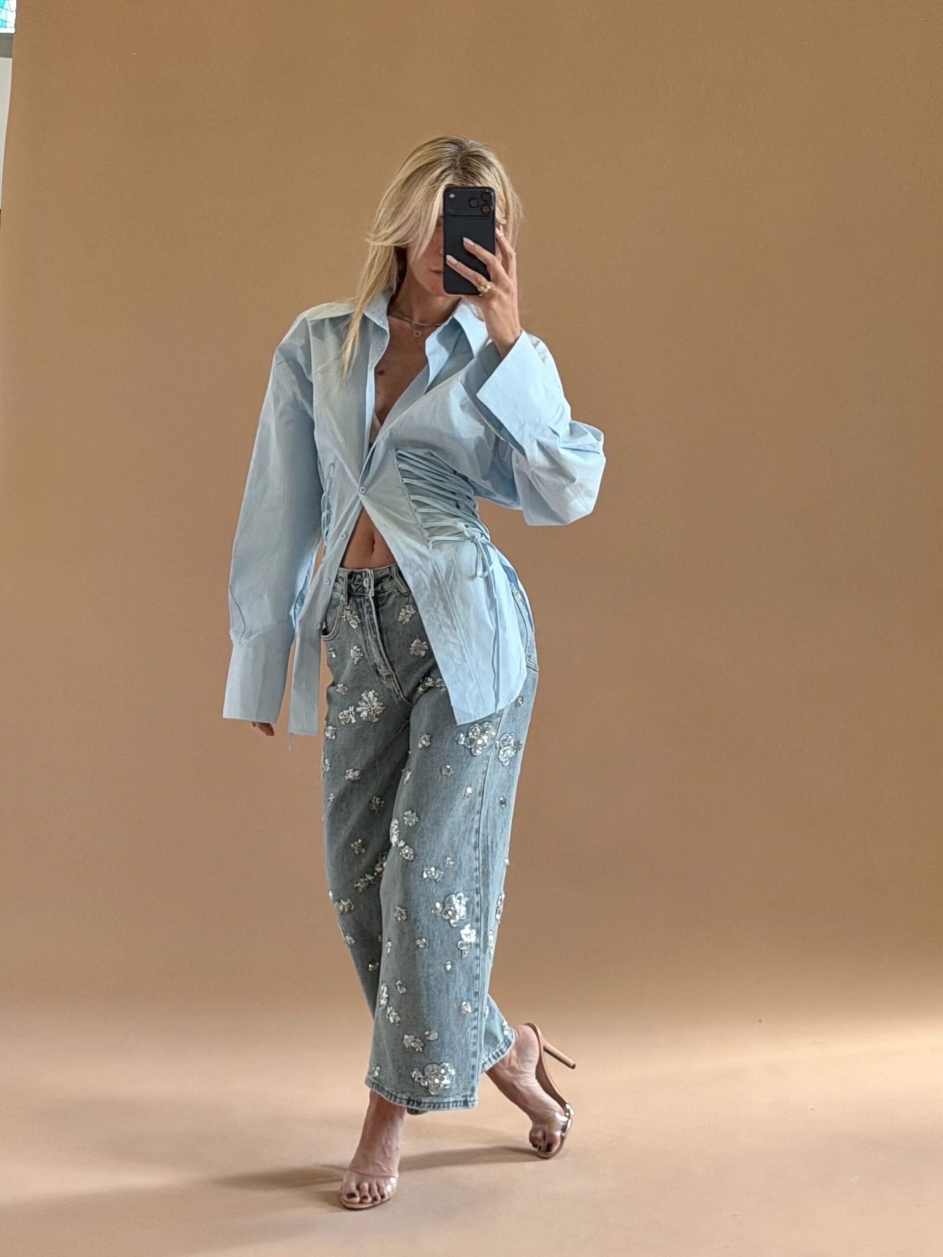 A standout denim piece that elevates everyday outfits with a touch of sparkle.