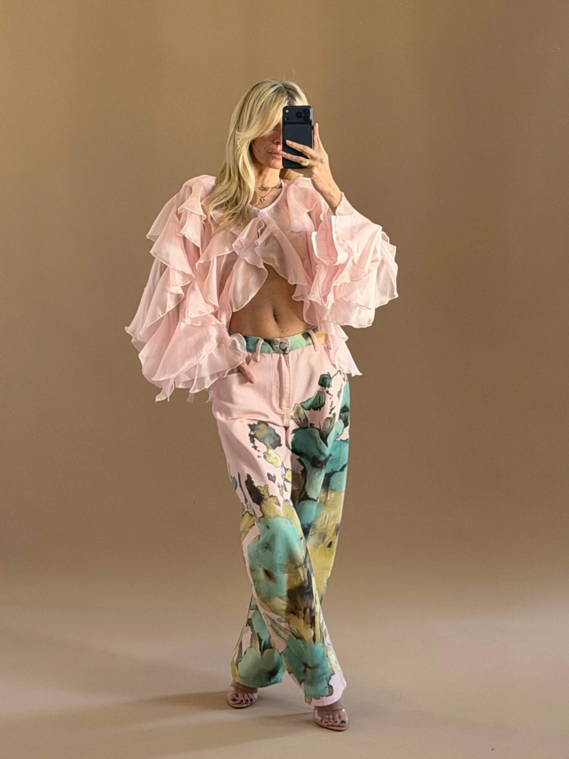 Η ιδιαίτερη φόρμα του φαρδαίνει στο πόδι και στενεύει απαλά στο τελείωμα, δημιουργώντας μοντέρνα σιλουέτα και statement αποτέλεσμα.