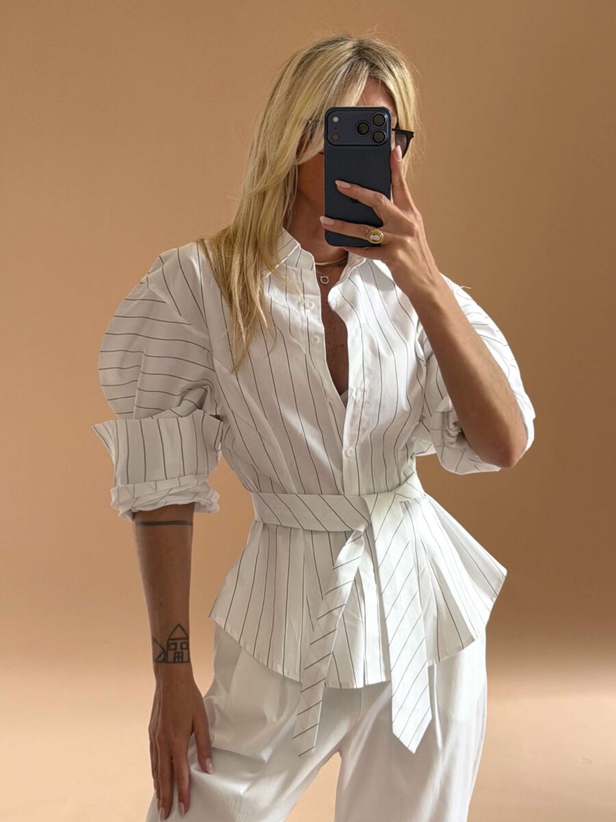 White Pinstripe Balloon Sleeve Shirt