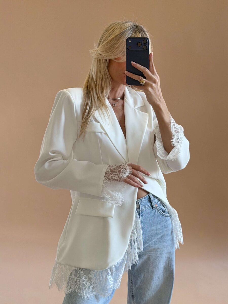 Σακάκι σε minimal γραμμή με ιδιαίτερο άνοιγμα στο πίσω μέρος που δημιουργεί μοντέρνο layered εφέ.