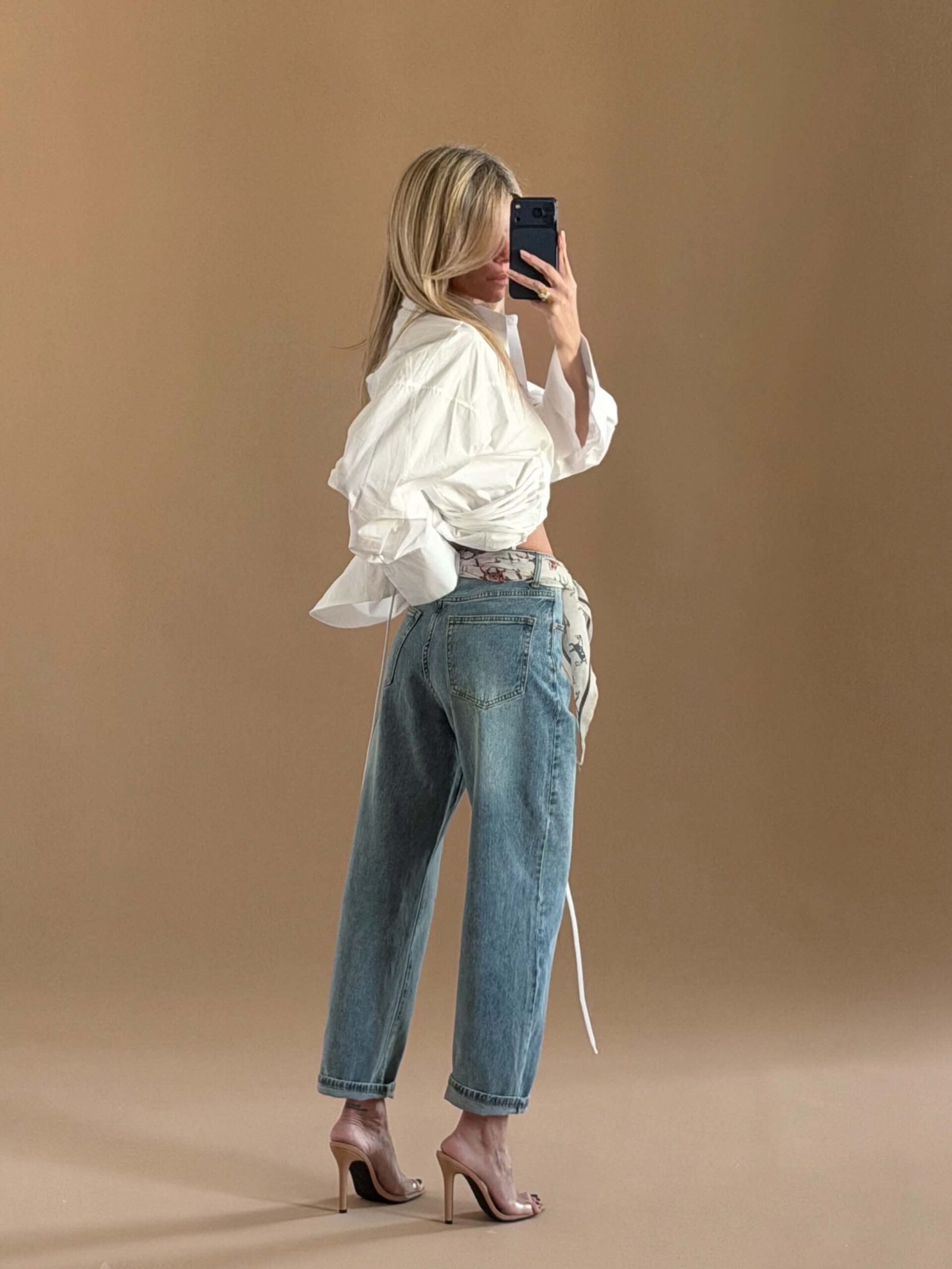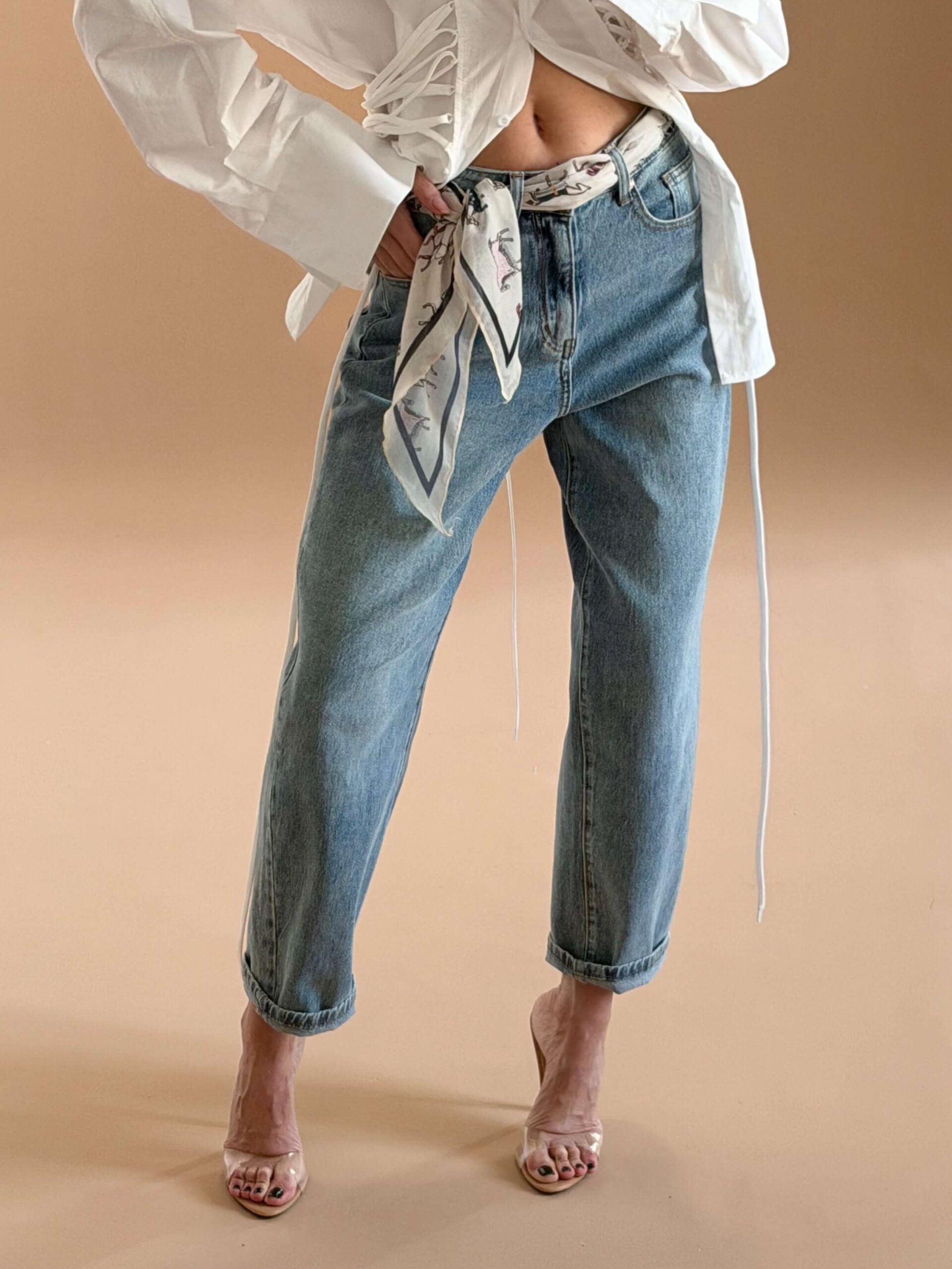 Washed blue mom fit jeans with a classic high-waist silhouette.