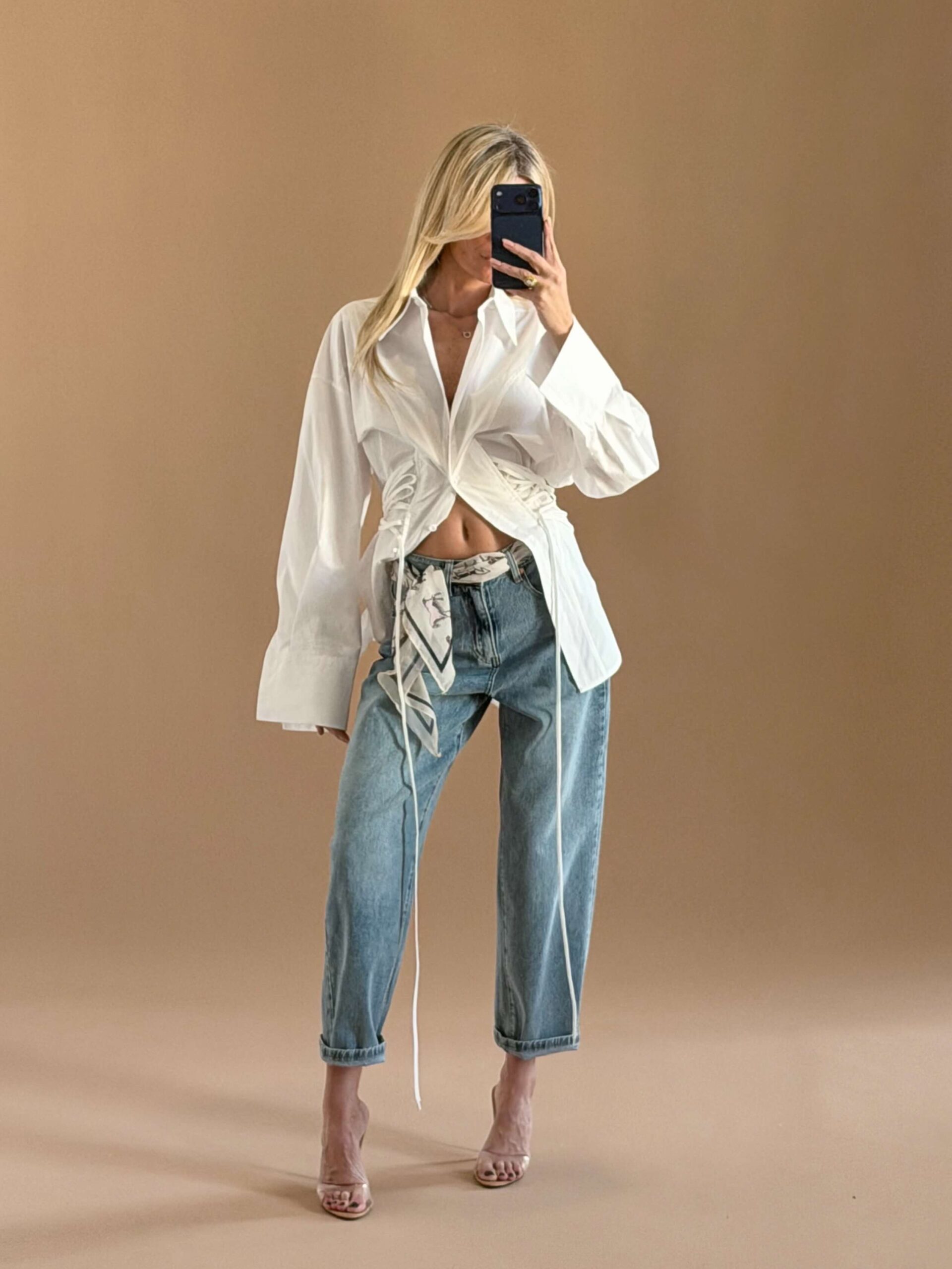 Τζιν παντελόνι σε γραμμή mom fit, σε μπλε washed απόχρωση, με κλασική ψηλόμεση εφαρμογή.