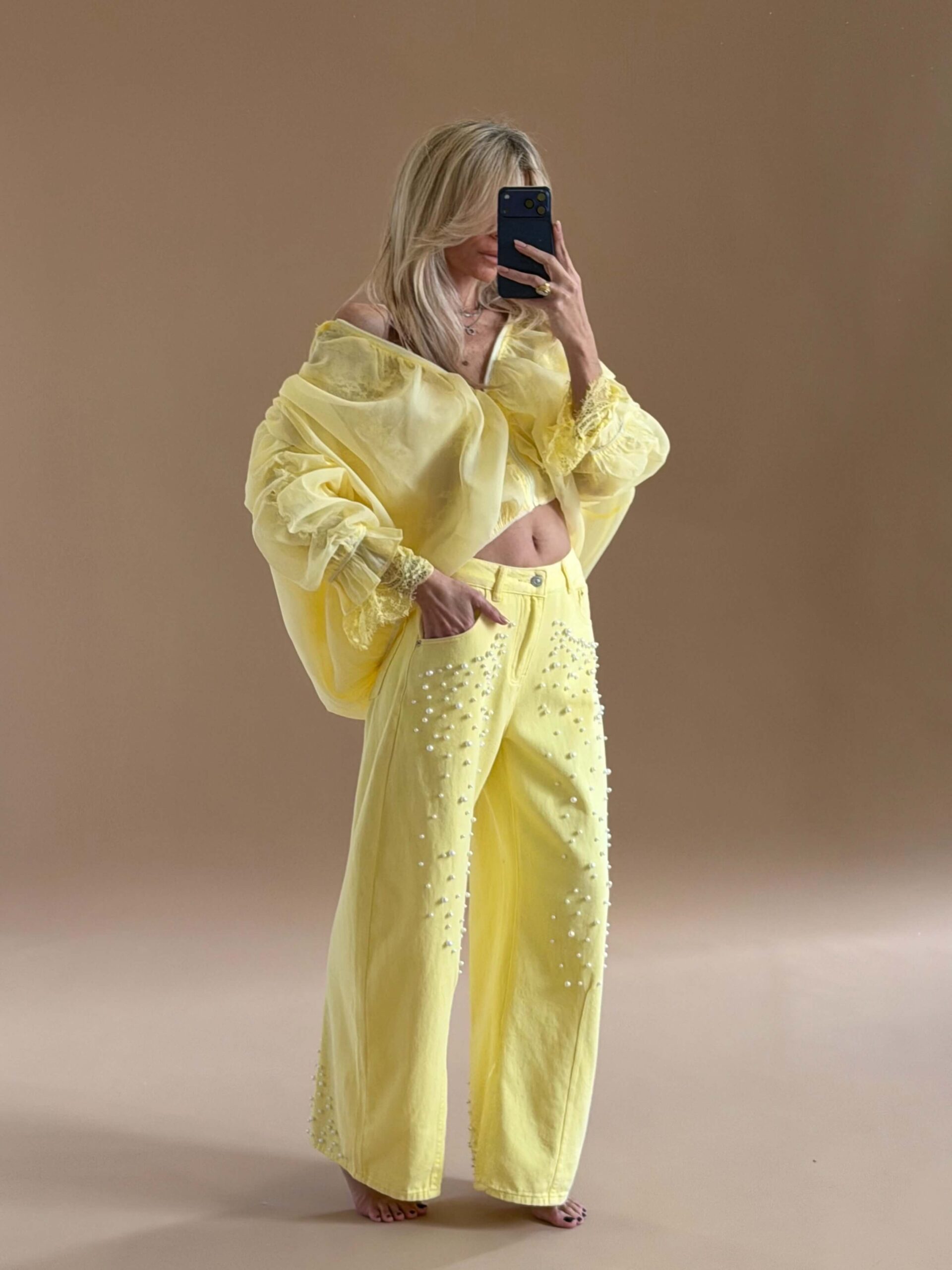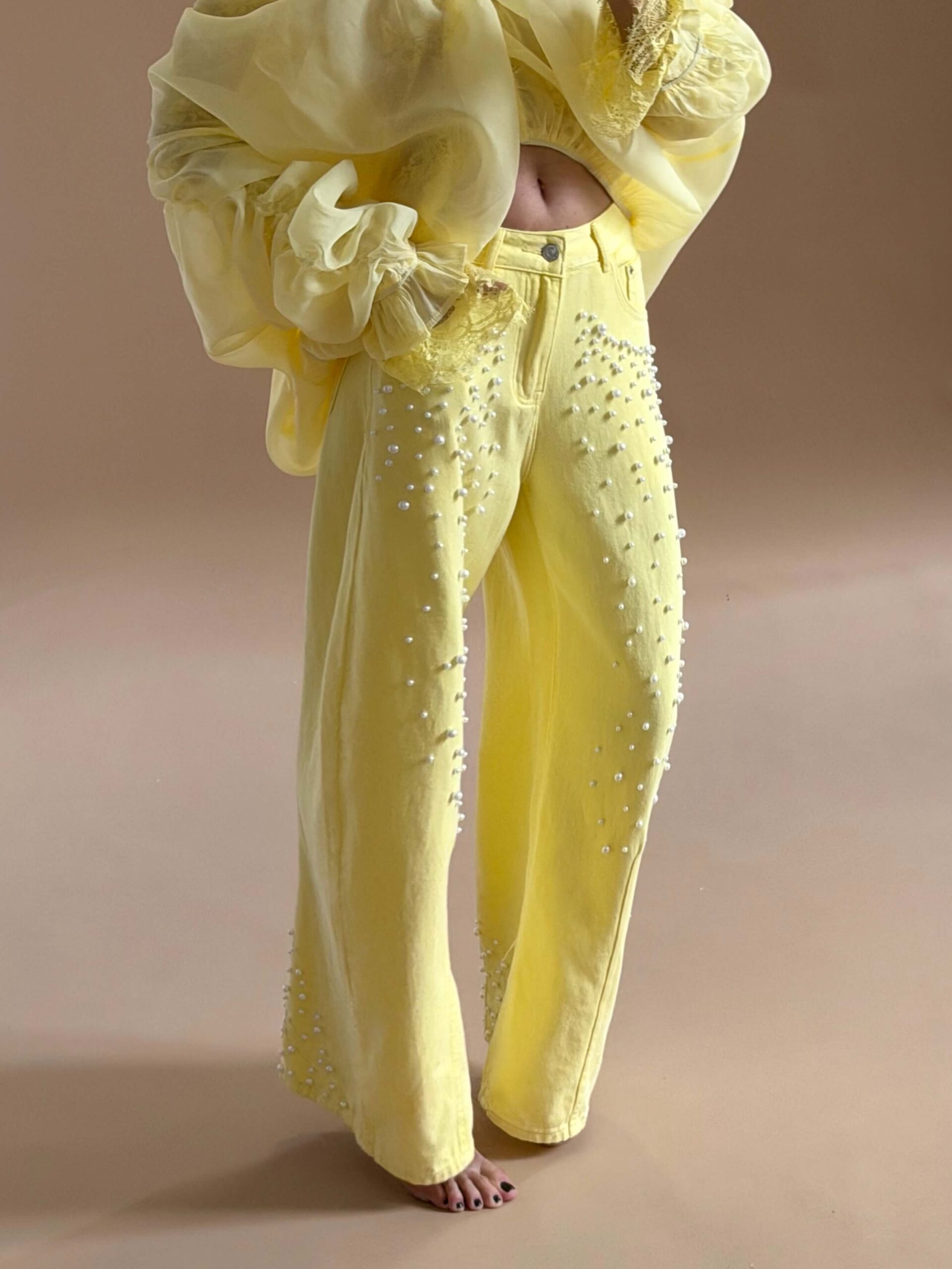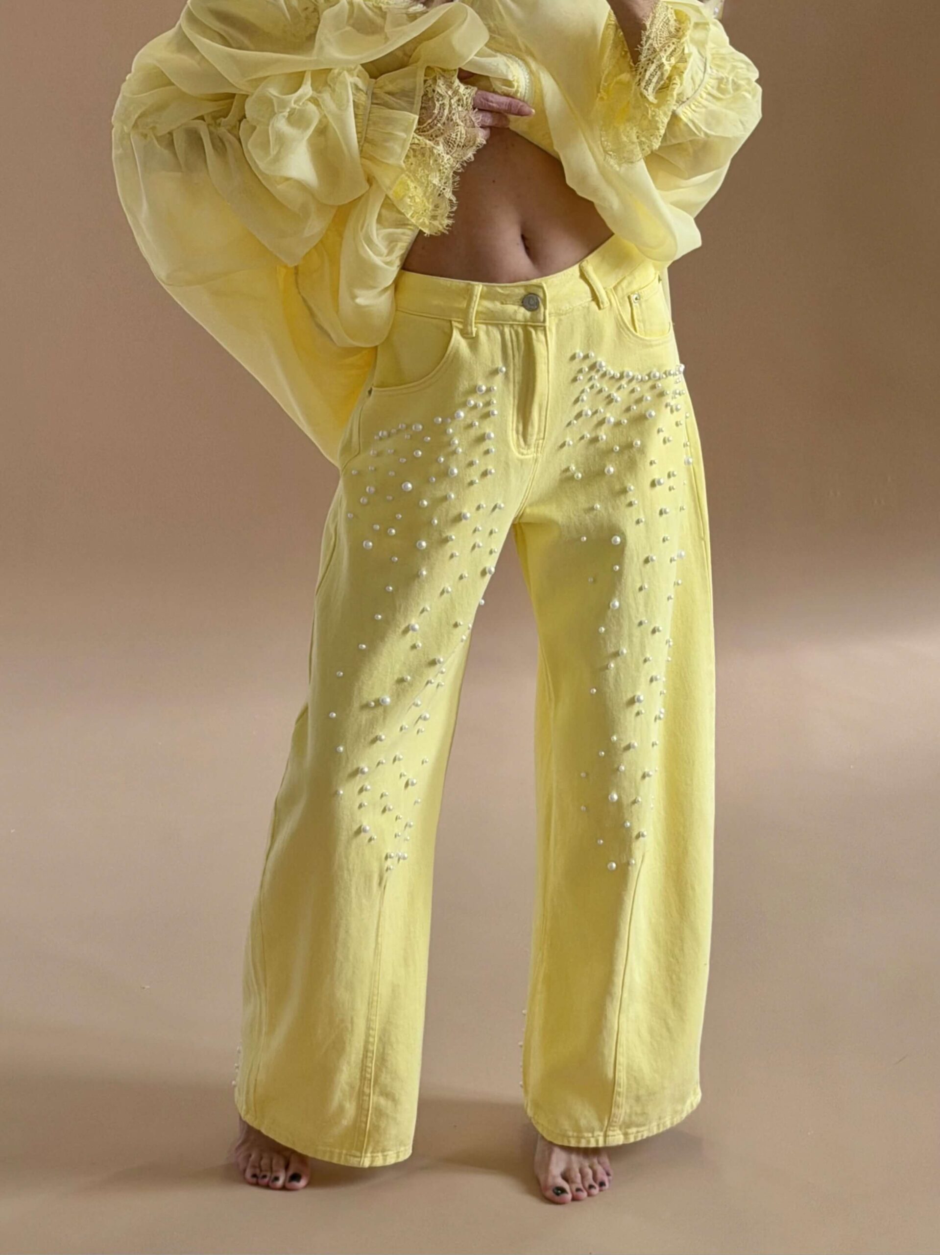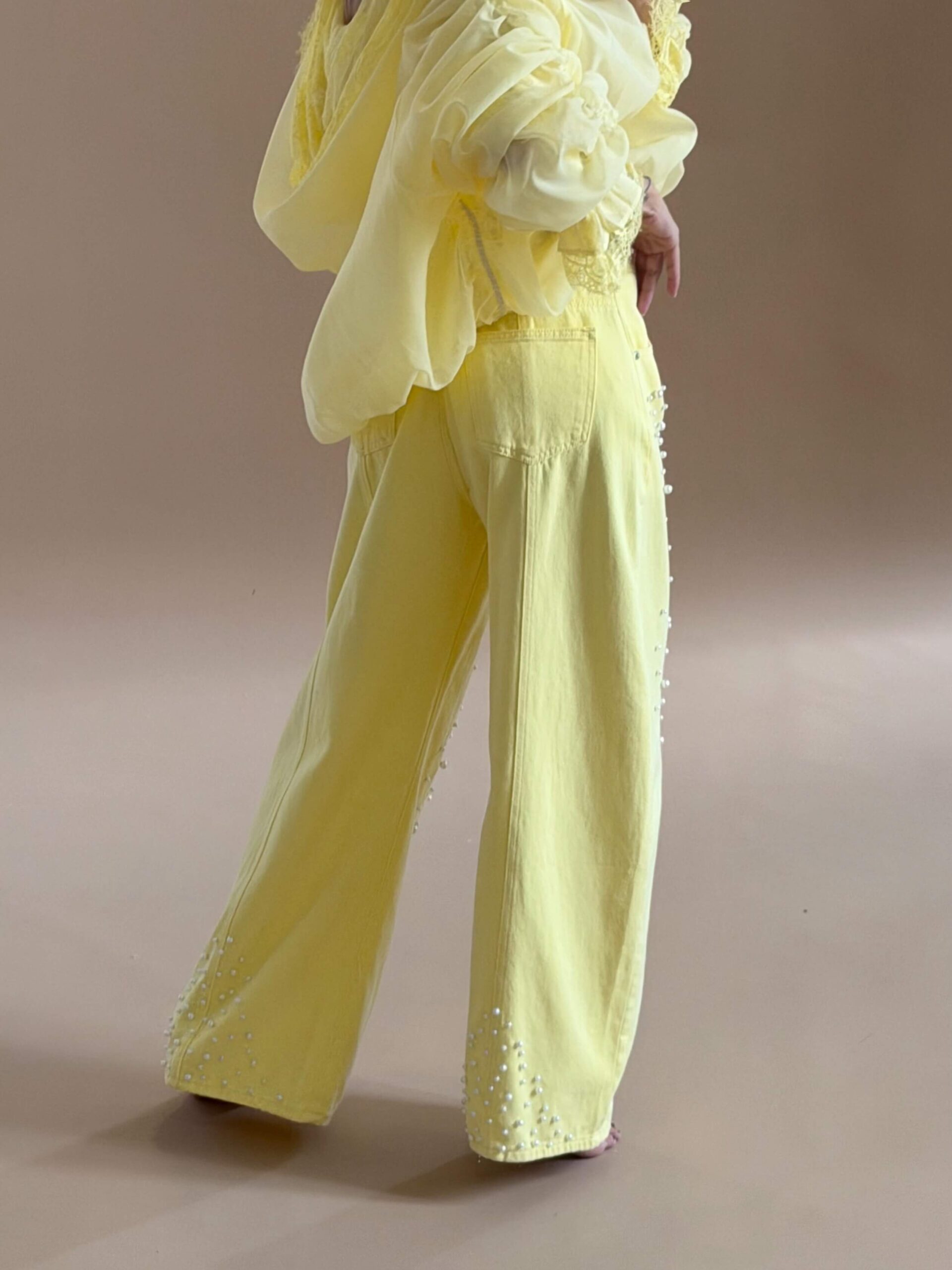 Pearl Detail Straight Denim – Yellow