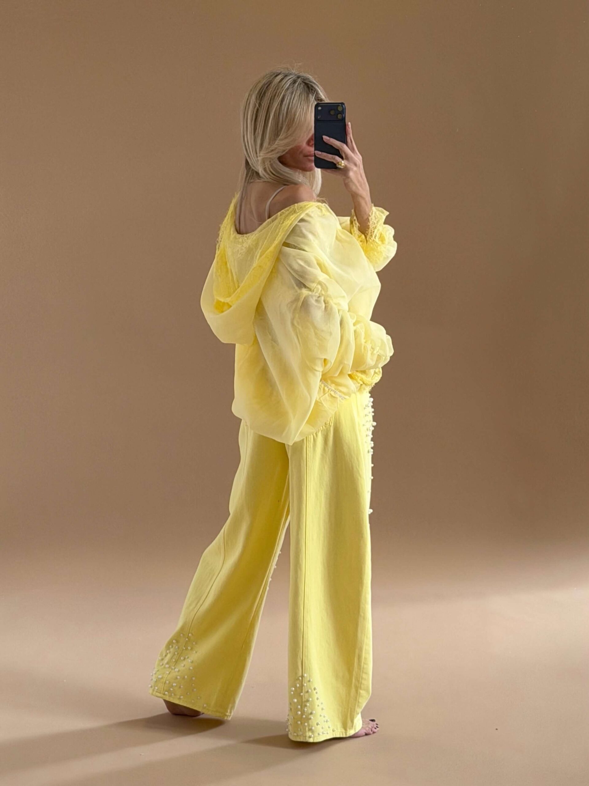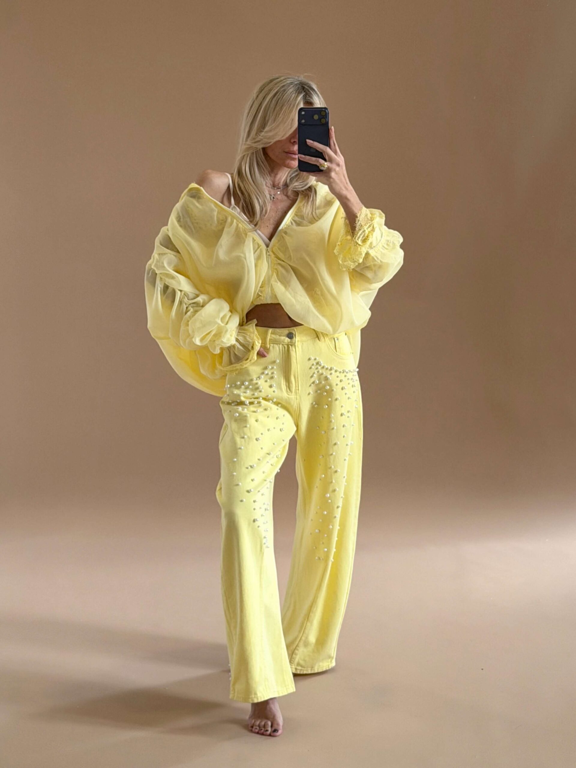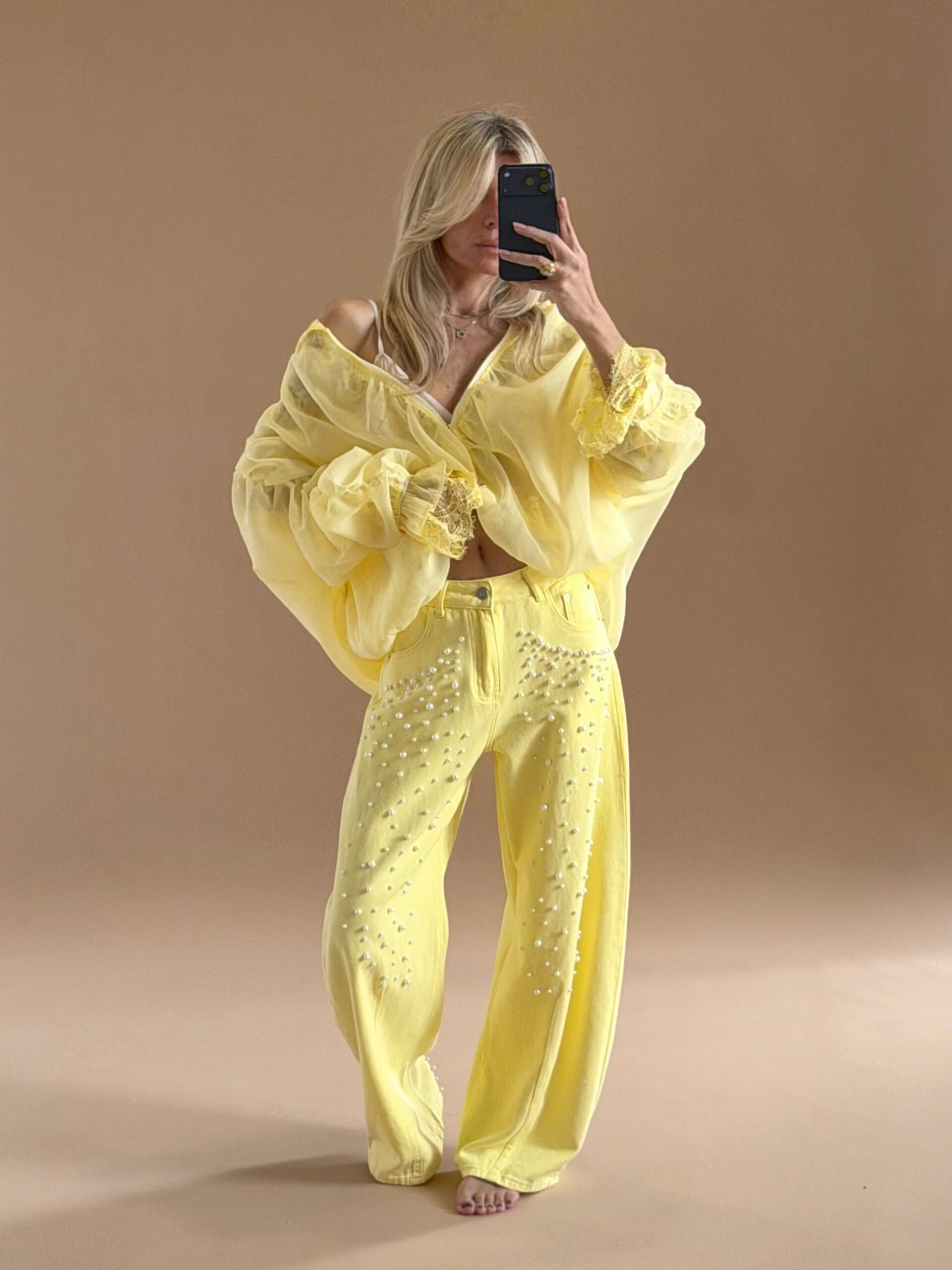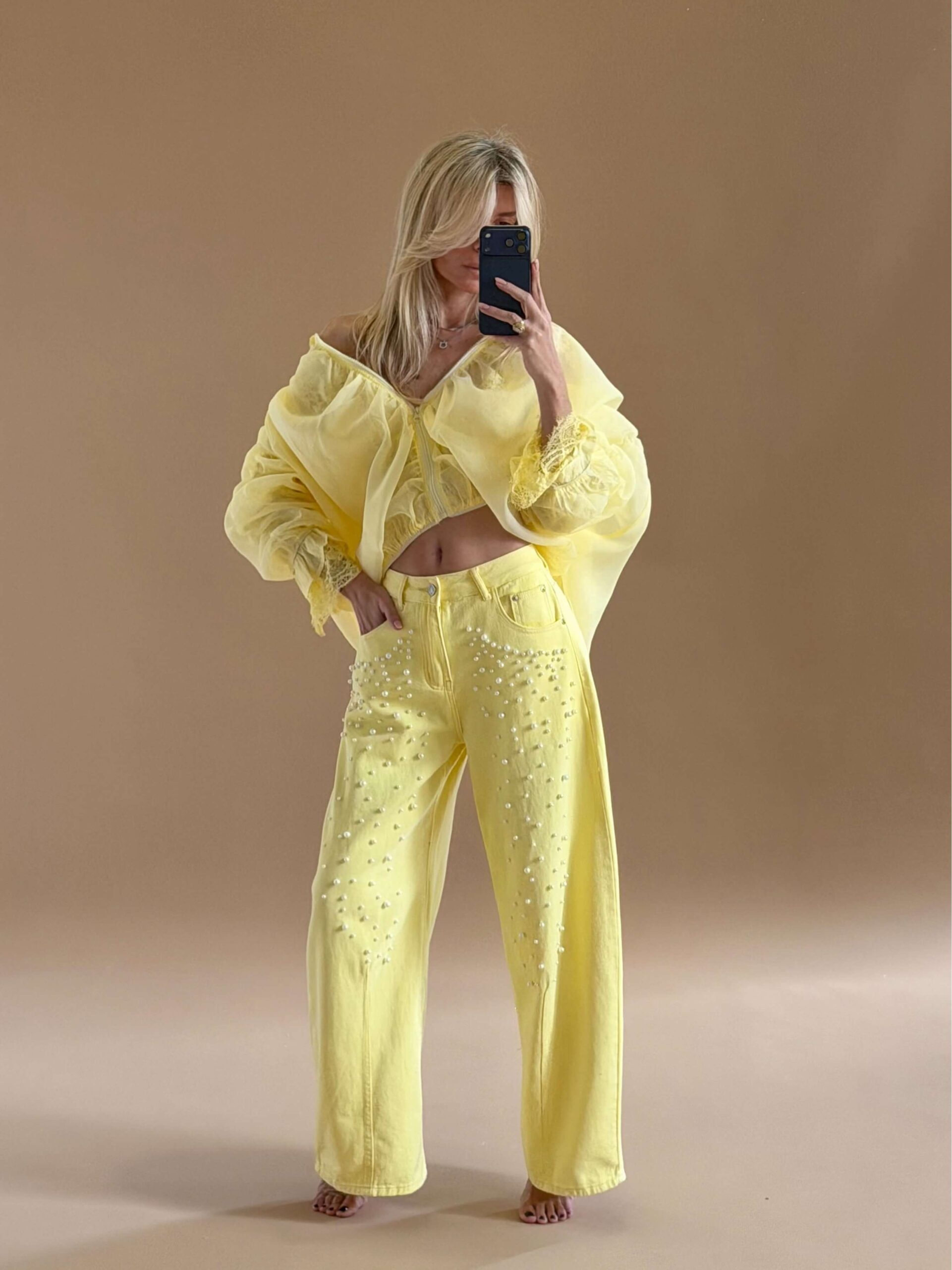 Pearl Detail Straight Denim – Yellow