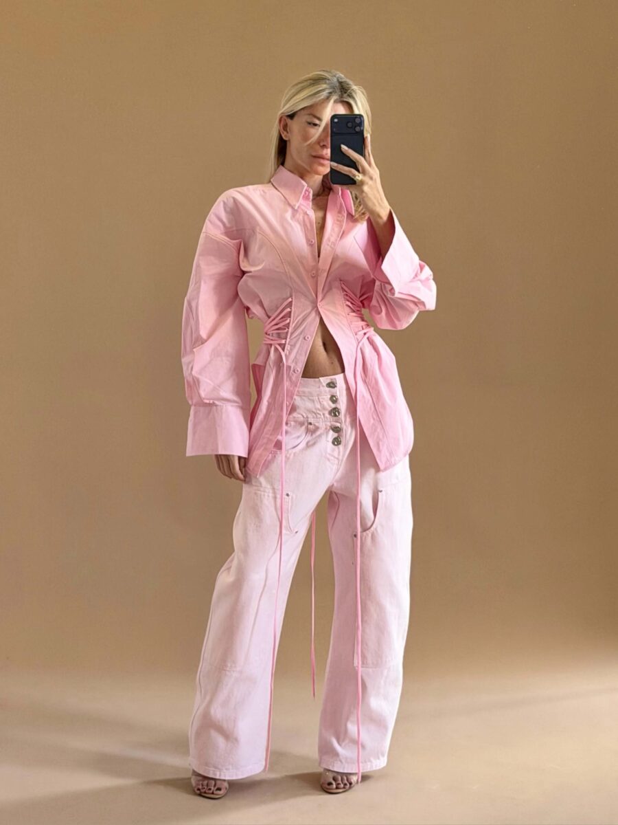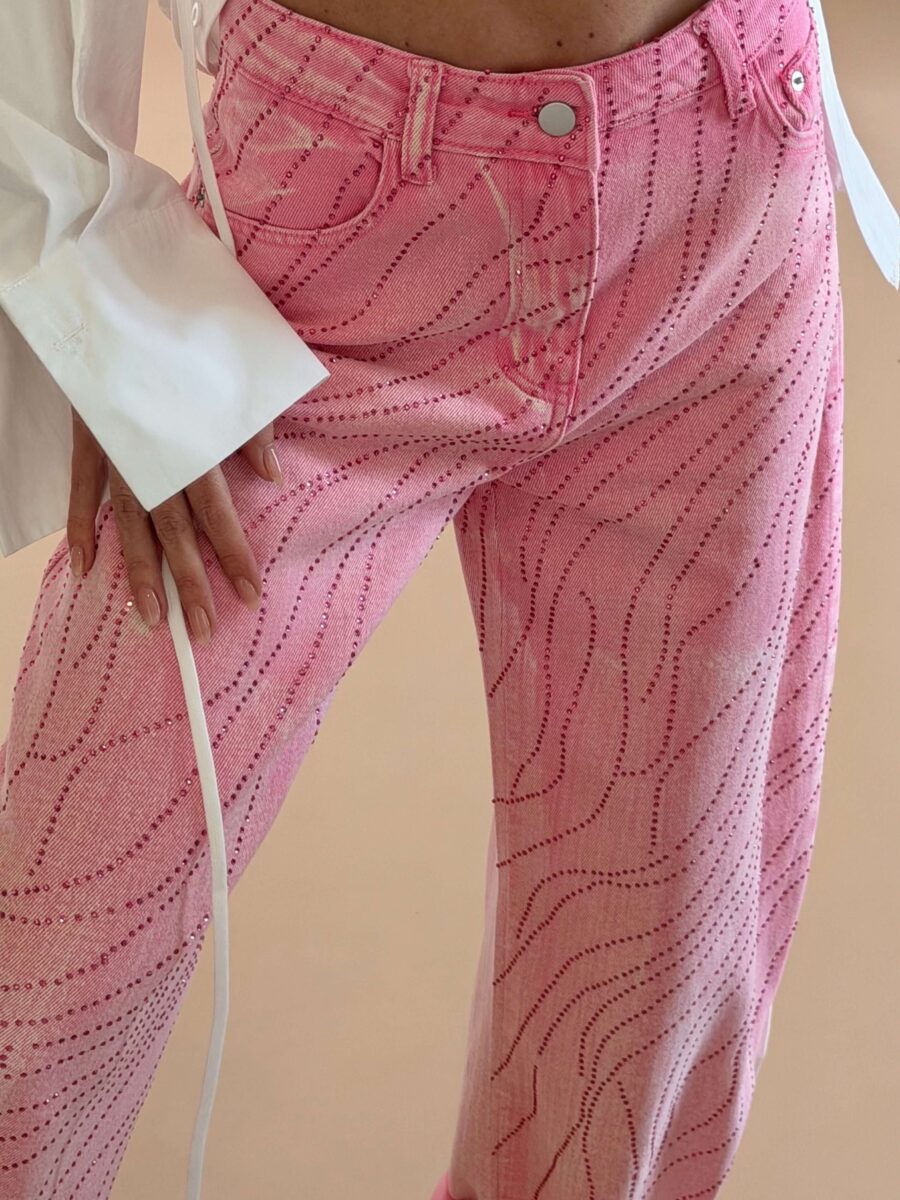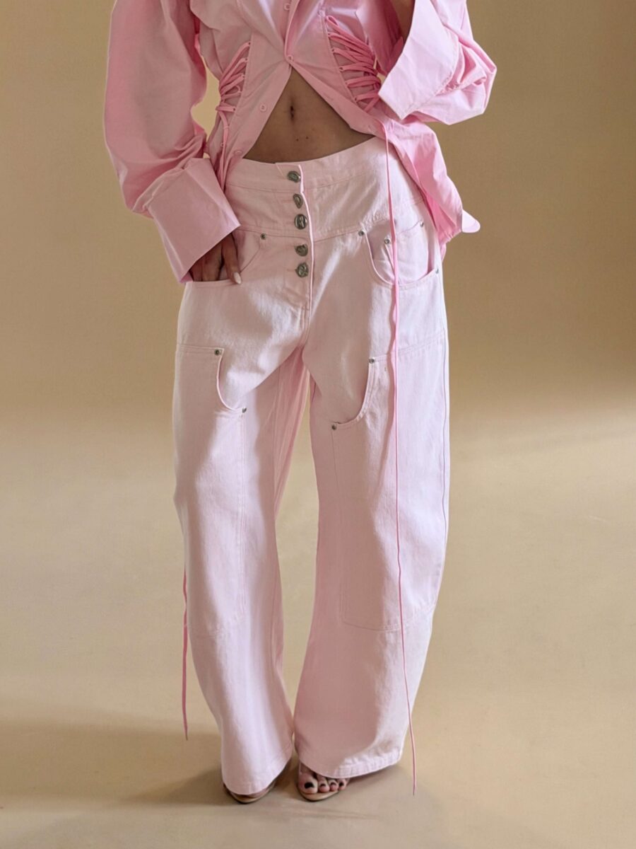 Pink High-Waist Wide Leg Jeans With Button Detail