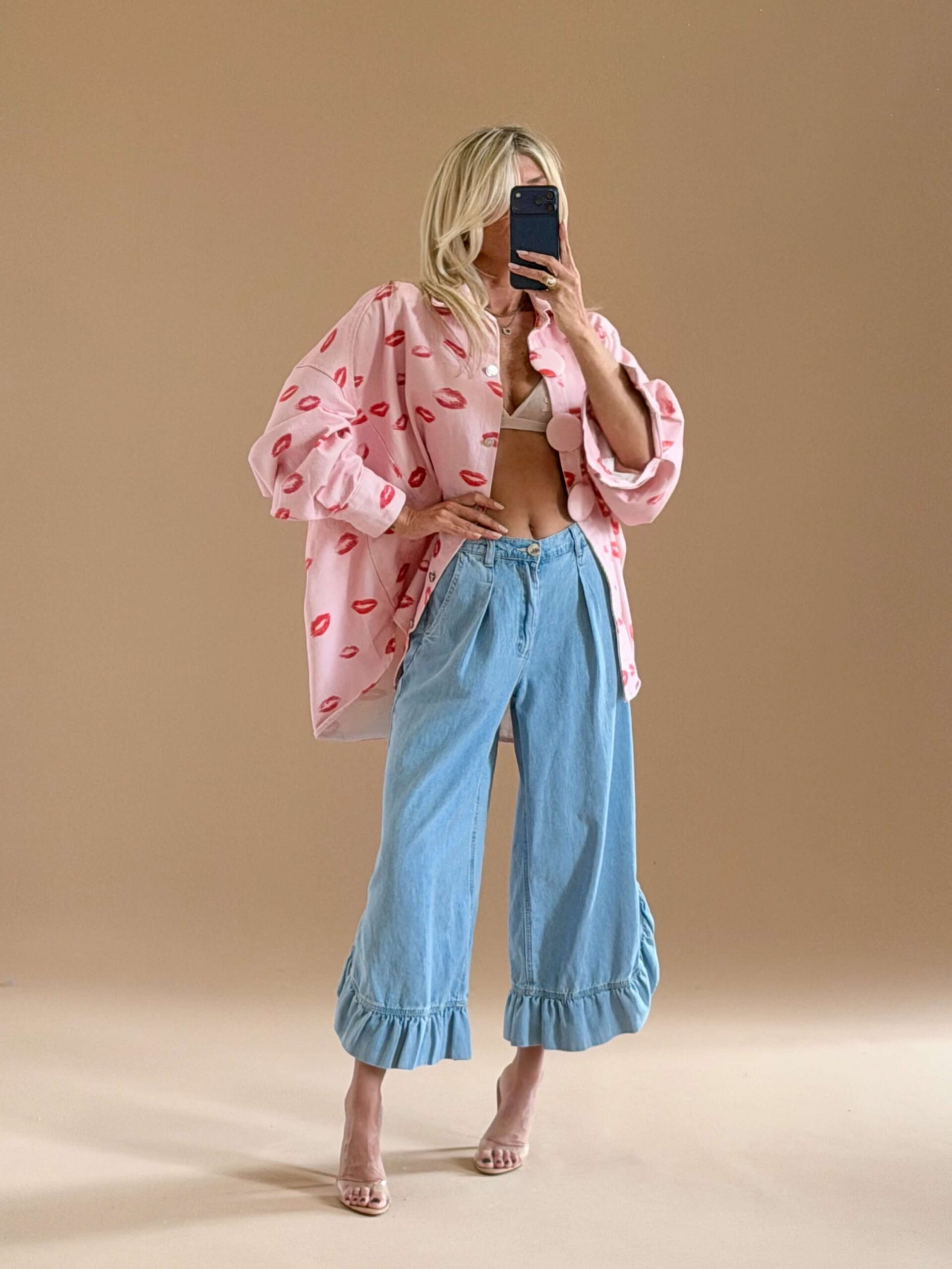 Finished with a ruffle hem and a subtle side slit for added movement.