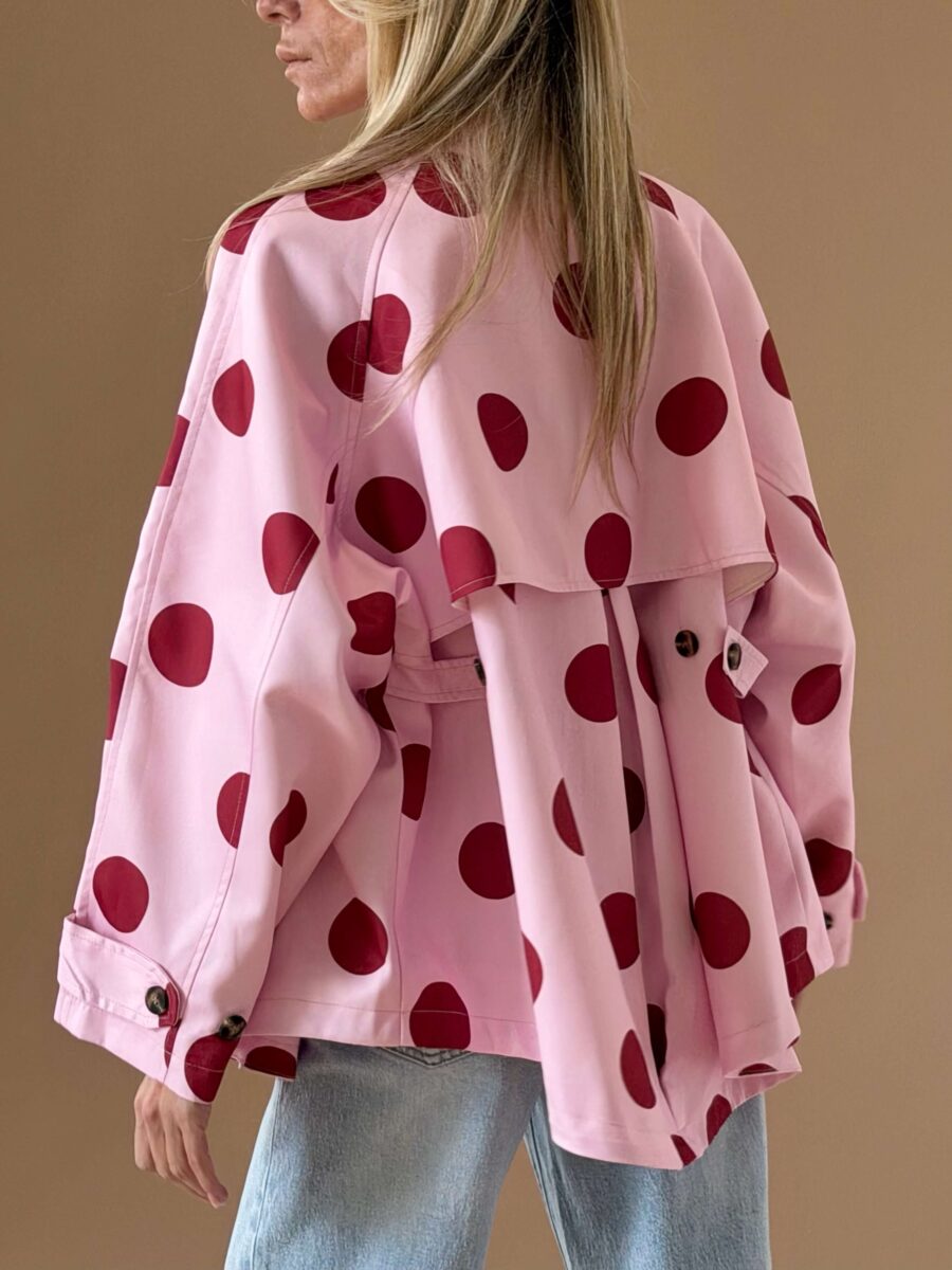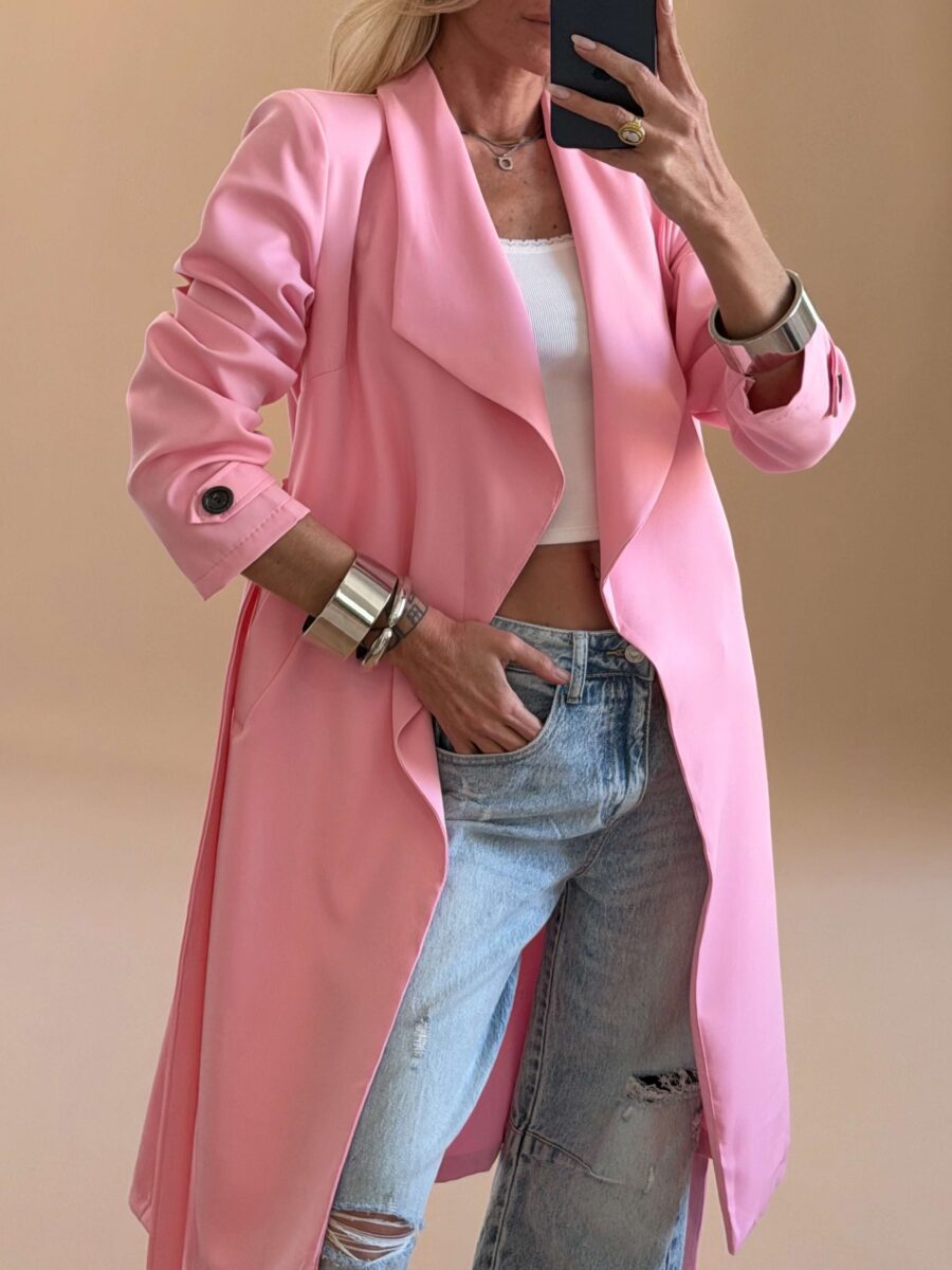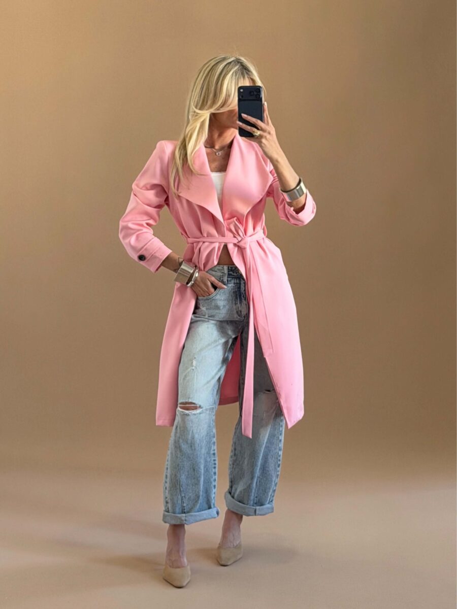 Διαθέτει έντονο γιακά, διπλό κούμπωμα μπροστά και ζώνη στη μέση για ρυθμιζόμενη εφαρμογή.