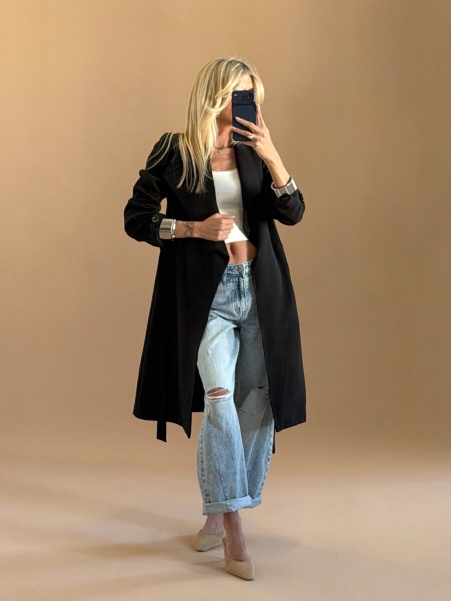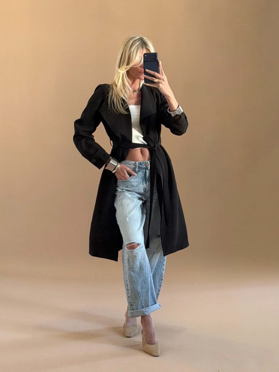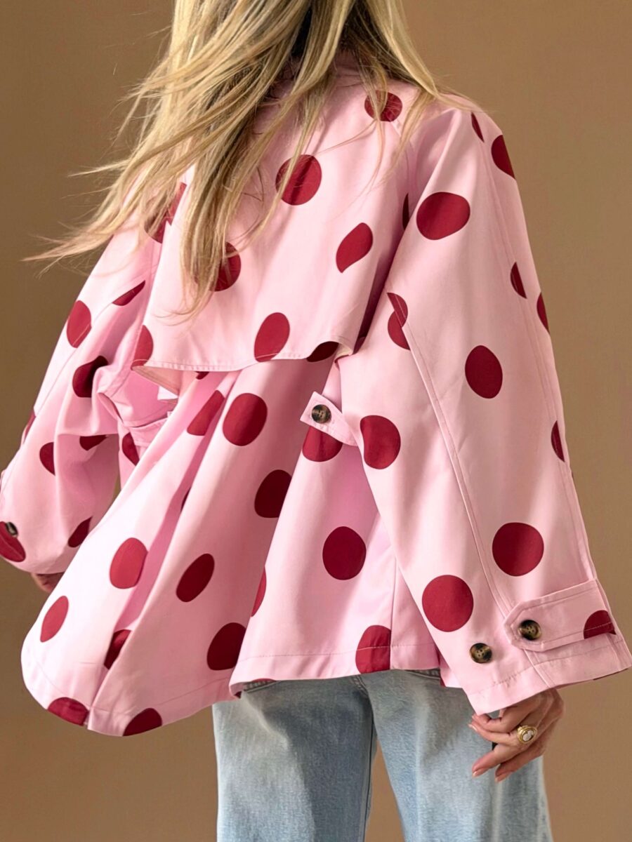 Διαθέτει έντονο γιακά, διπλό κούμπωμα μπροστά και ζώνη στη μέση για ρυθμιζόμενη εφαρμογή.