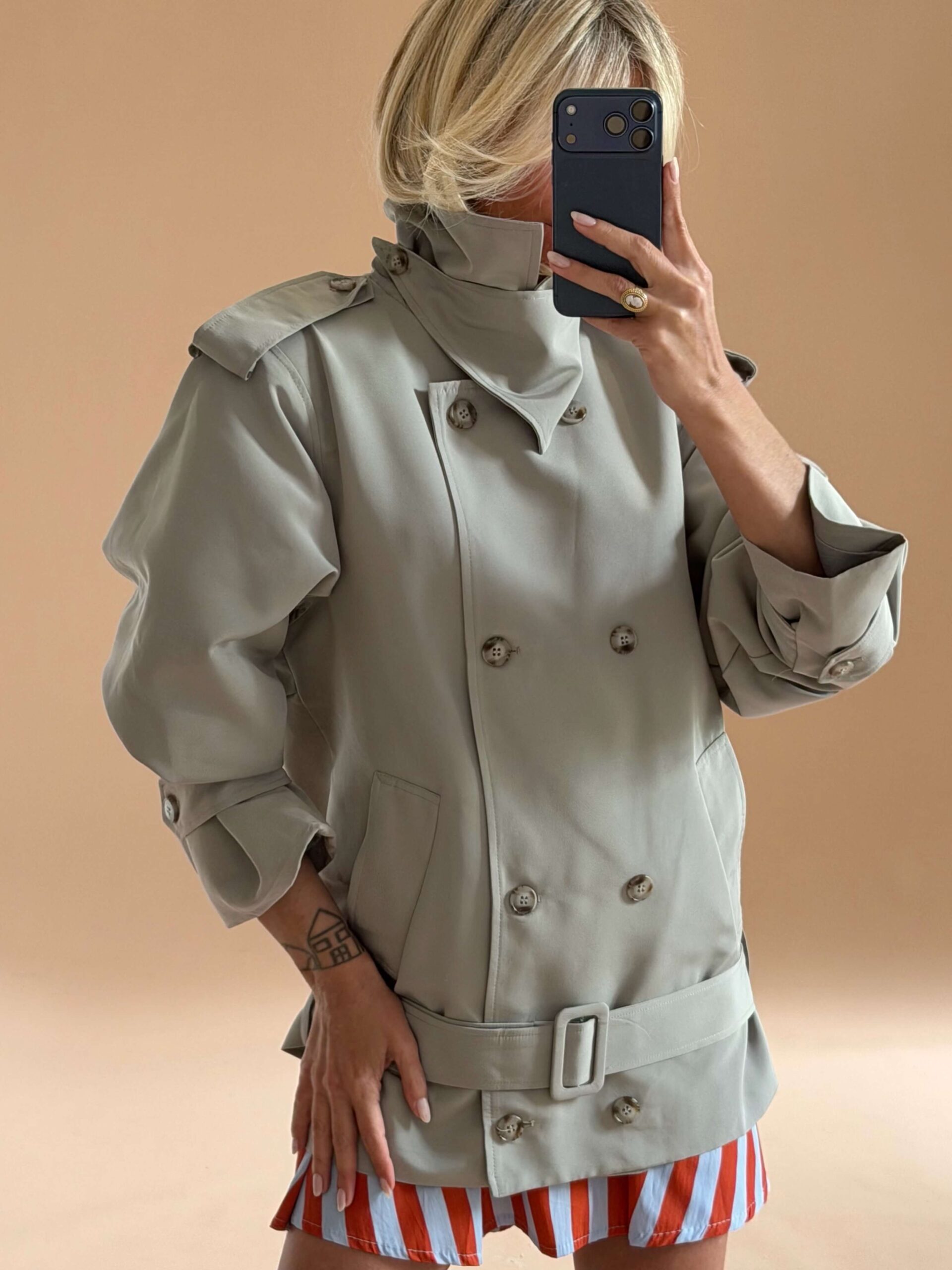 Κοντό trench πανωφόρι σε γκρι απόχρωση με δομημένο σχεδιασμό και σύγχρονη αισθητική.