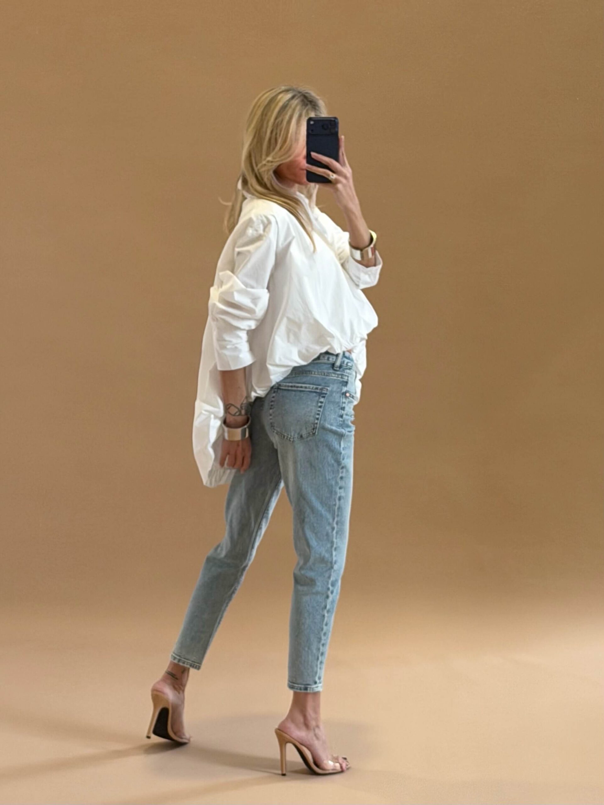 Denim jeans with hight waist and a slim fit silhouette, gently tapering towards the hem.