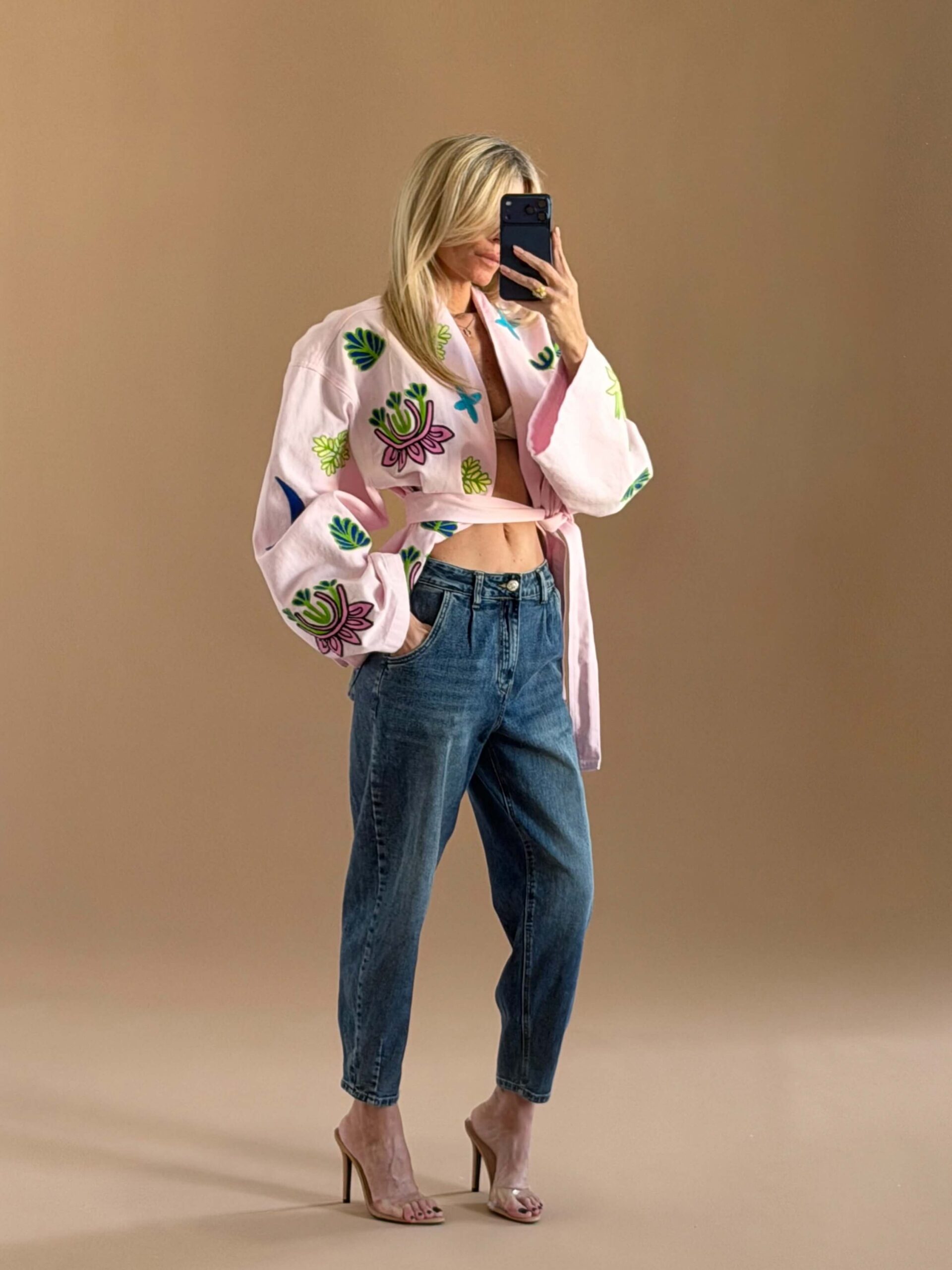 Τζιν παντελόνι ψηλόμεσο με πιέτες στο μπροστινό μέρος, που χαρίζουν άνεση και κομψή εφαρμογή.